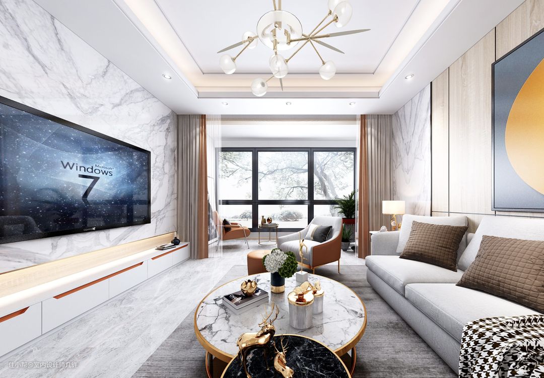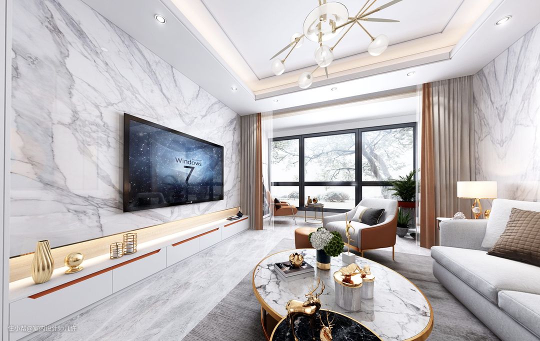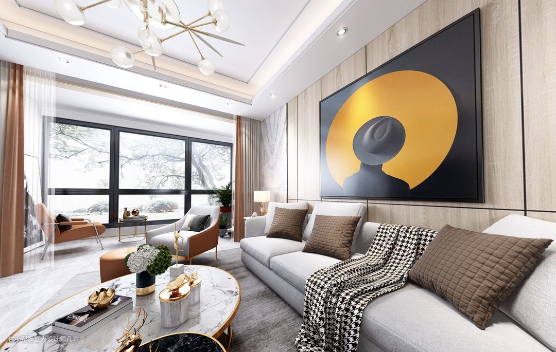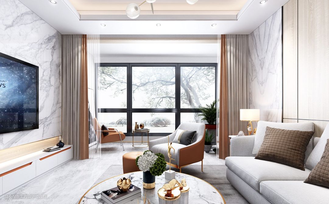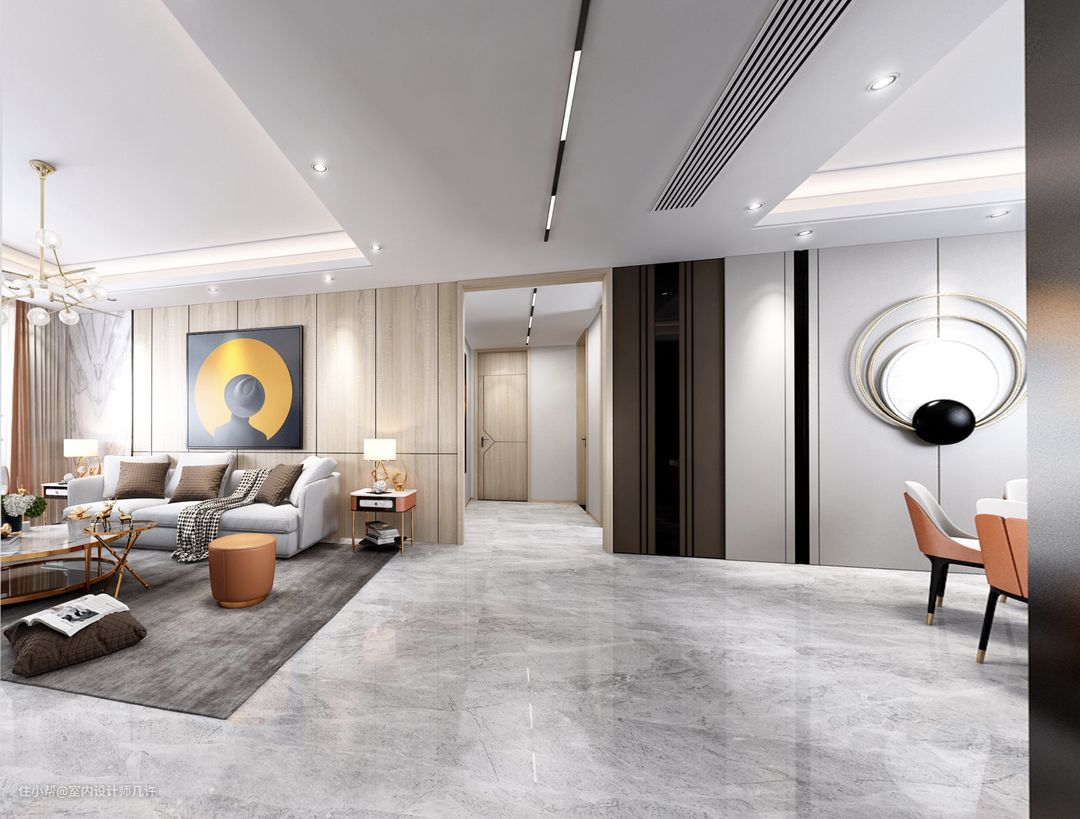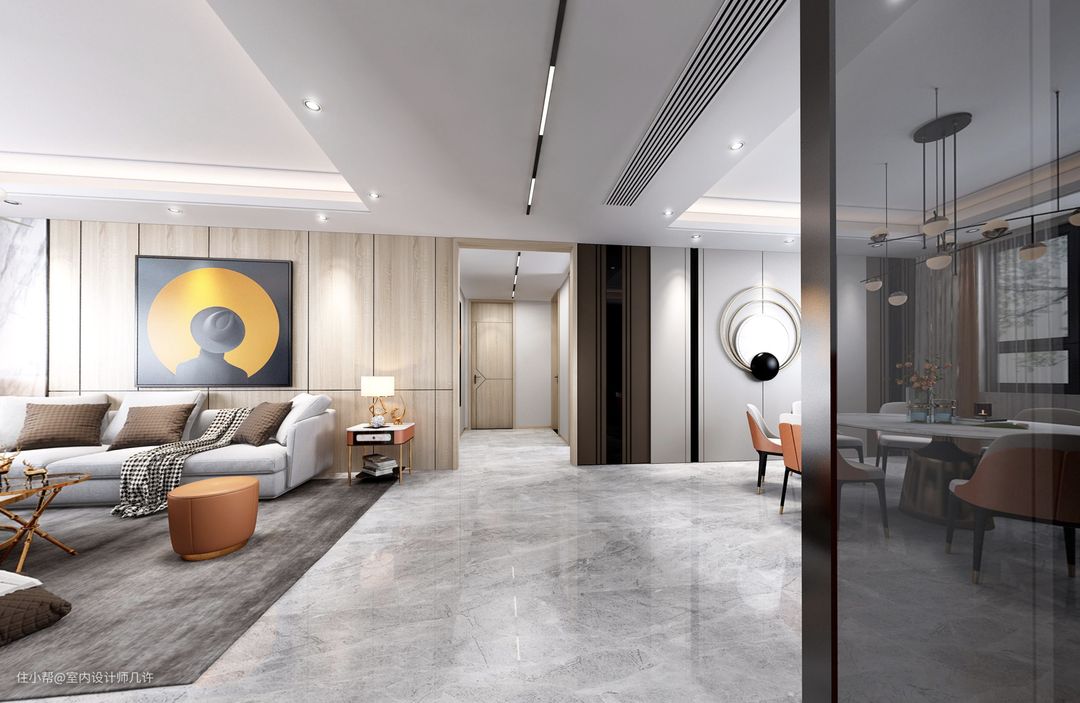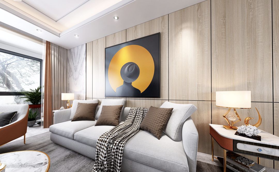 灰色大理石纹样的地砖呼应电视墙灰色大理石,沙发背景木纹墙板,材质冷暖协调。冷色空间点缀少许橙色,色调对比鲜明。设计线条简洁明快、装饰元素少,搭配现代风格家具,美感十足。