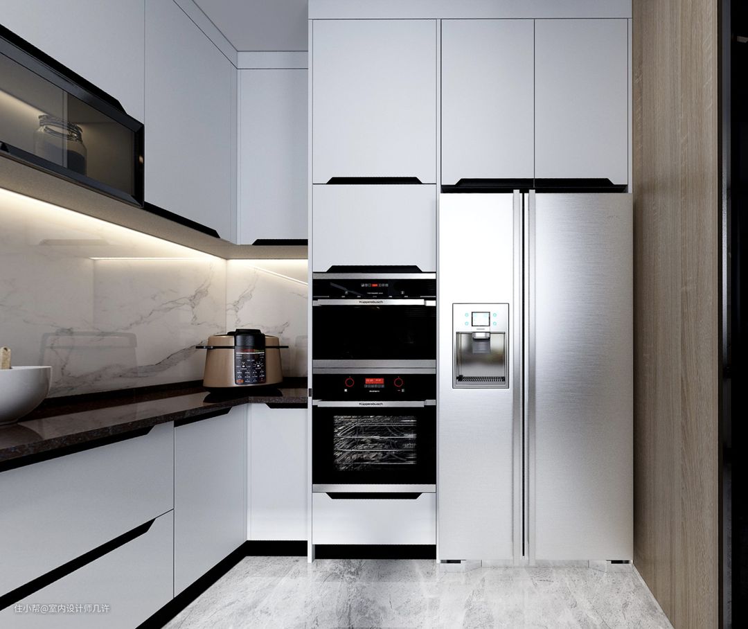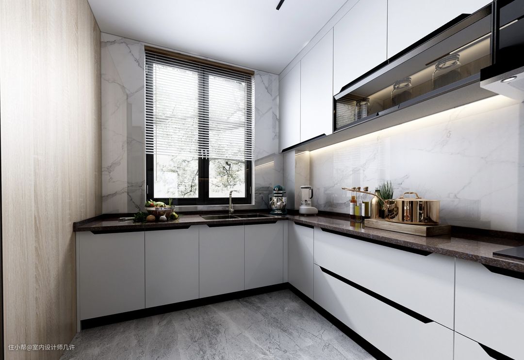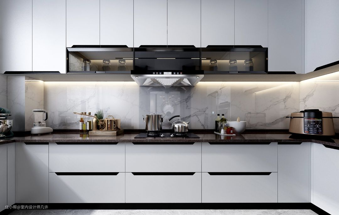 整体定制橱柜,深色台面与白色橱柜形成极大视觉冲击,辅助灯带的设计,人性化又兼具品质感