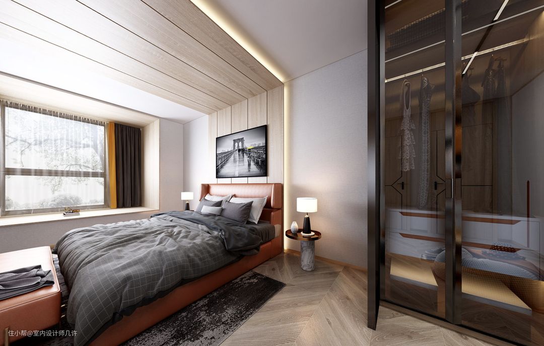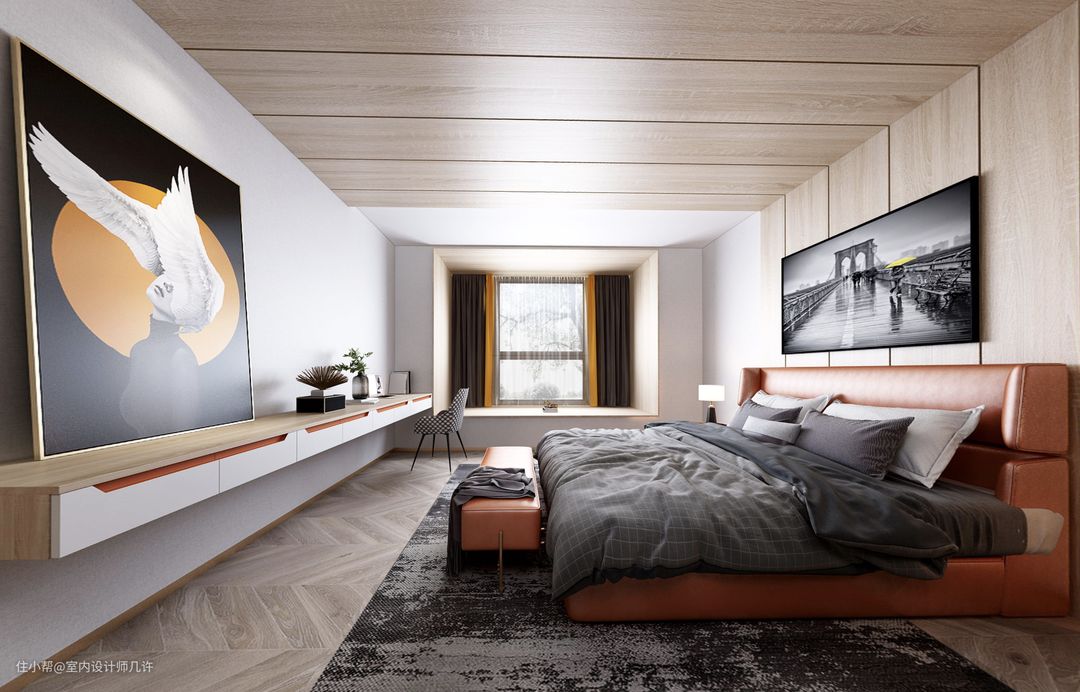 及其个性的床头背景墙板延伸到顶面,相对于平常卧室的氛围更为灵动,设计感十足