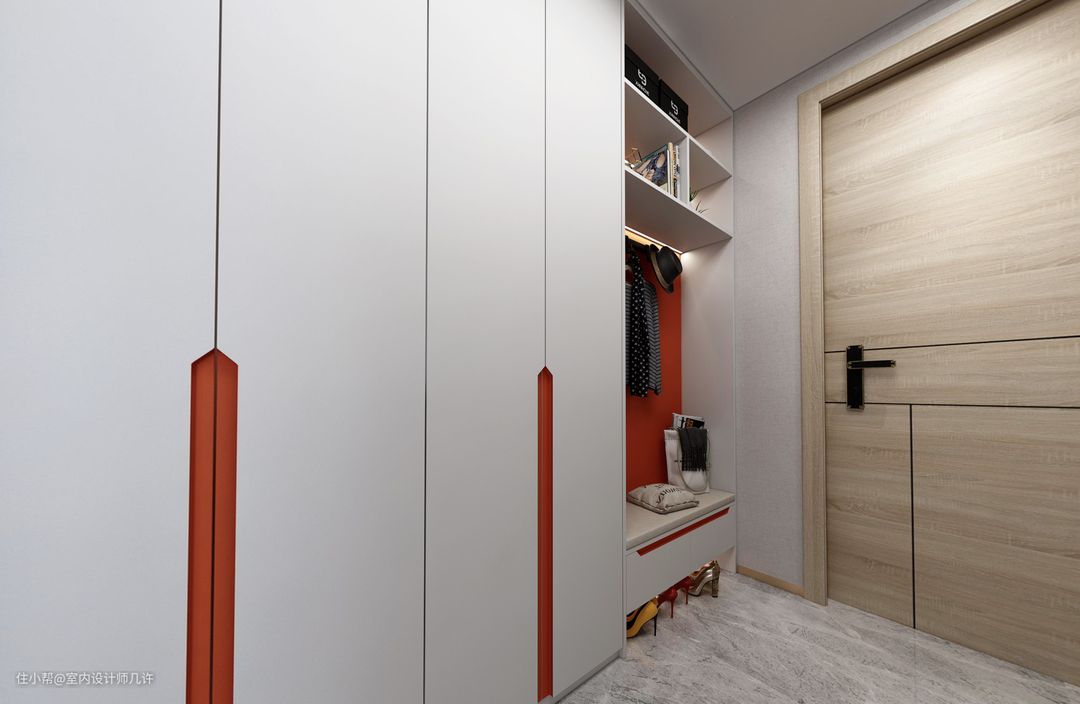 整体到顶的鞋柜收纳。功能性设计,线条简约流畅,色彩对比强烈,明快时尚。