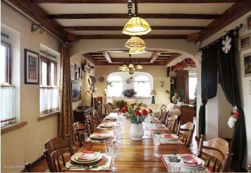 氛围对就餐而言至关重要,设计师通过#木质吊顶、金丝绒布艺以及#原创手工彩绘的吊灯,打造质朴的感觉和自在的优雅。而且其中的餐厅家具都是利普家工坊原创设计并制作的,这一切都是让整个空间和谐统一的小细节。