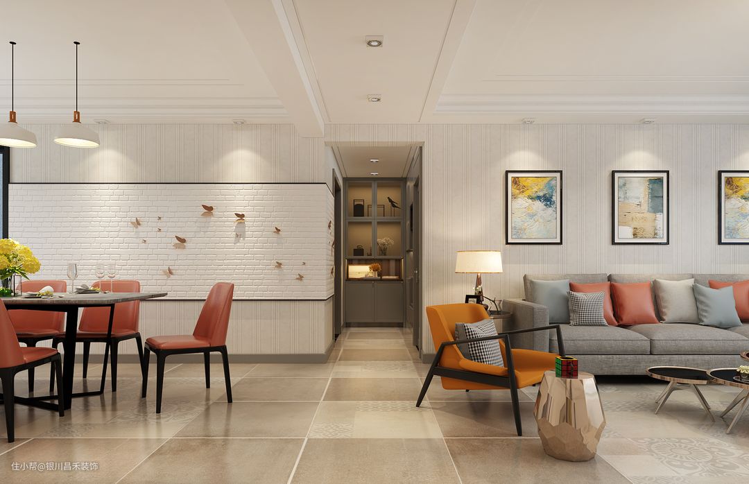 餐厅除了餐桌还有一个简单的小吧台,方便平时物品放置,挂画和文化砖墙面都在呼应客厅空间,西瓜红和柠檬黄,提升进食欲望。