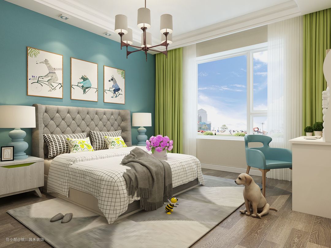 蓝色背景上的卡通挂画是一个令人愉快的亮点,柔软的草绿色清新明亮,营造放松身心的完美氛围。 对于孩子来说,这是一个十分可爱的现代化空间