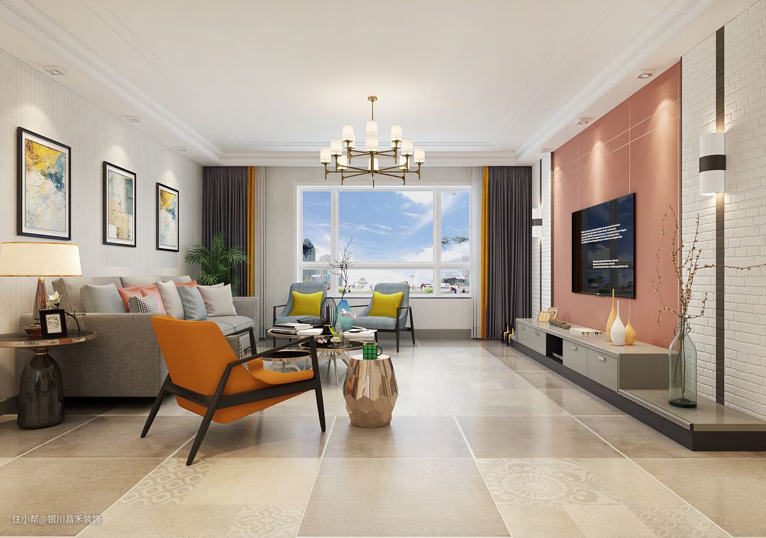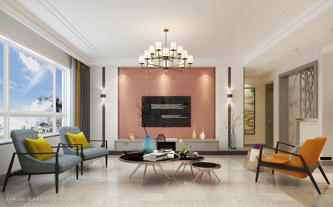 橘粉色电视背景墙结合白色文化砖,简洁而别致的设计,干净清爽有层次,金属、壁灯、玻璃瓶,流光溢彩间搭配出轻盈仙气的格调。