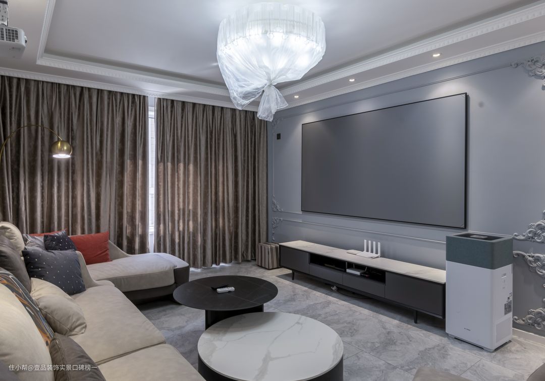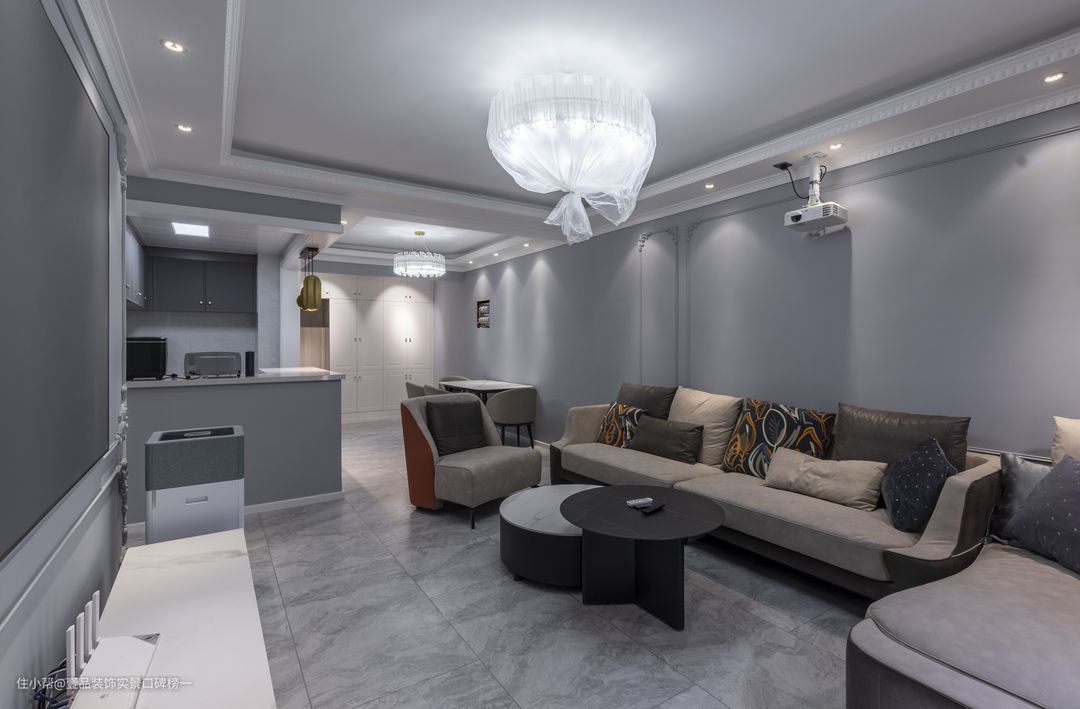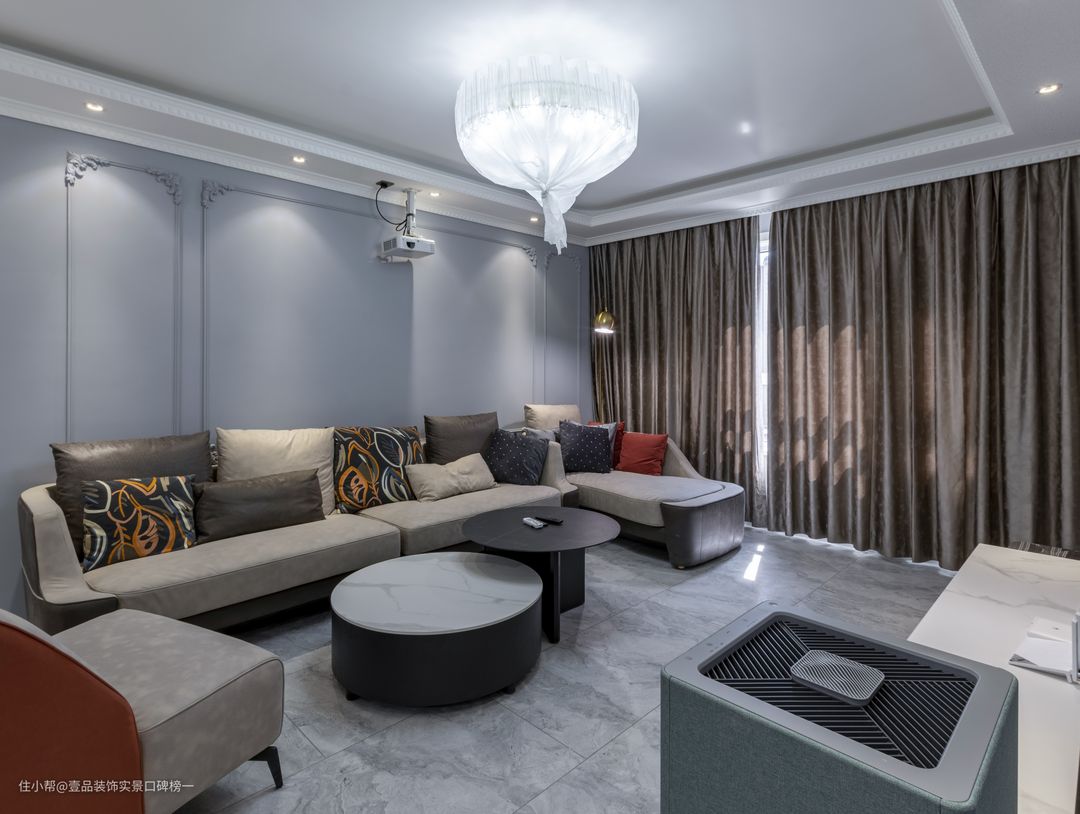 客厅的设计简约而大气,整体空间是比较通透的,地面选择用灰色的瓷砖铺贴,方便打理的同时视觉效果更好,再搭配淡蓝色的墙面,清新淡雅,客厅空间中有一个很大的亮点,在于作为年轻人,业主朋友放弃了传统的电视,做的是投影幕布,作为空间的娱乐设施,看电影的视觉体验感会更好