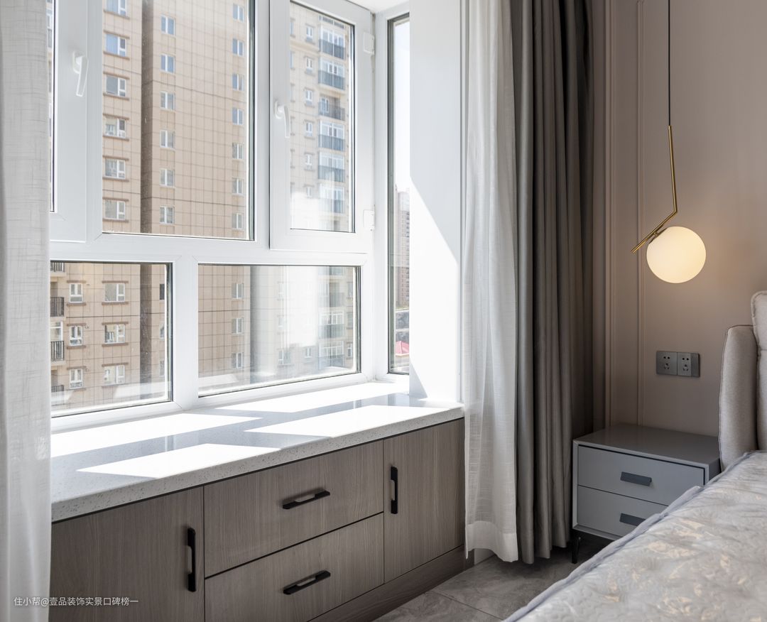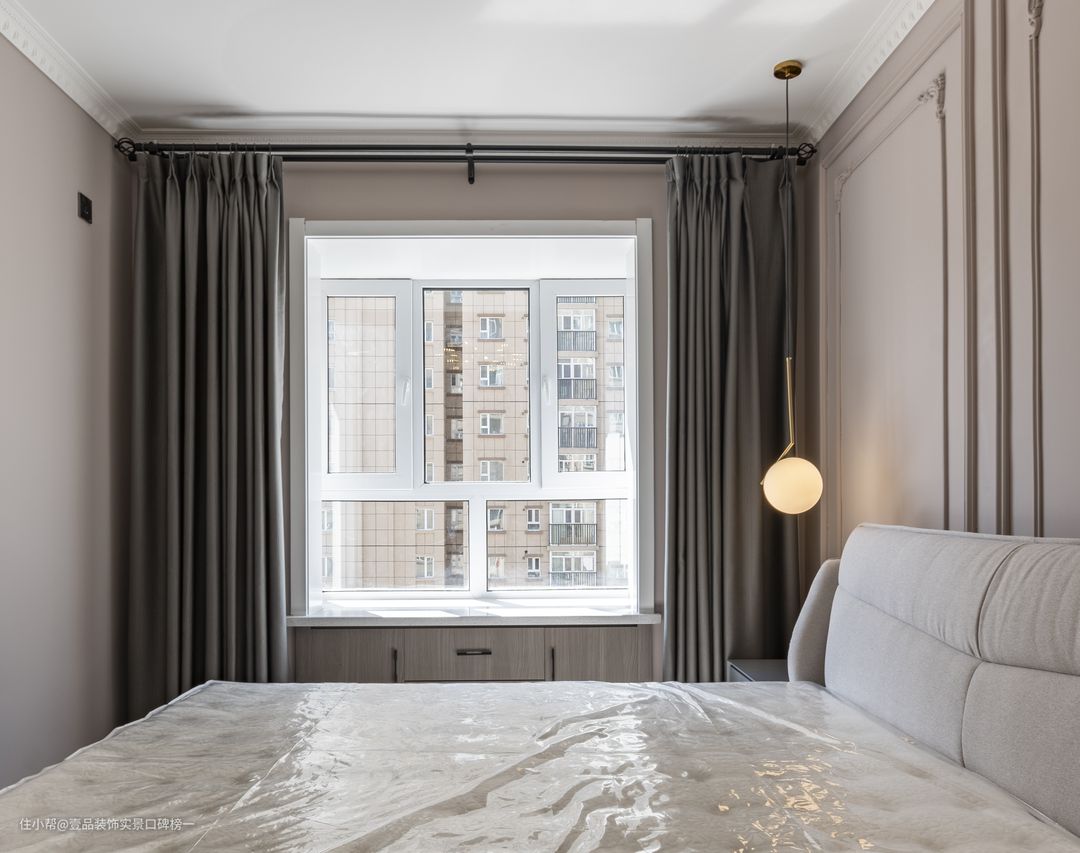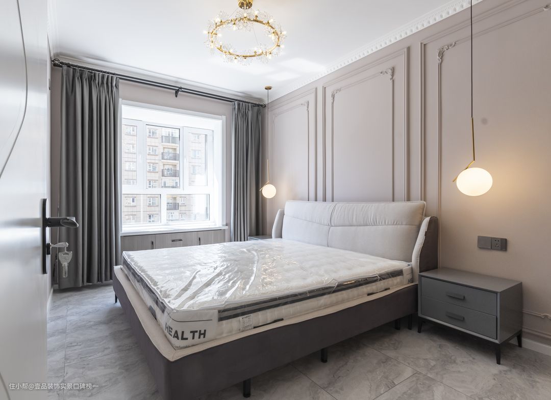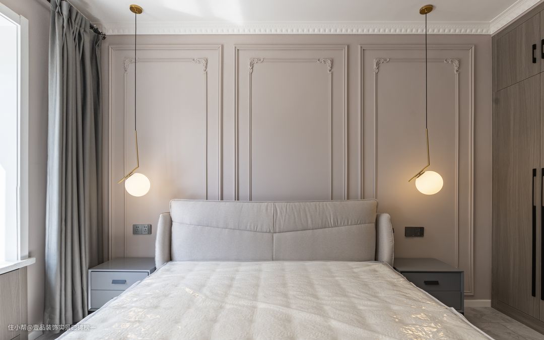 本案的卧室更是一个非常精彩的亮点,作为年轻人都有一个梦幻的公主梦,所以在主卧室的颜色选择上选择了粉色,粉色是很有讲究的,泰国艳丽会显得艳俗,太浅也体现不出粉色,莫兰迪色系的粉色添加了灰色调,整体又会显得非常的有质感。虽然整体也比较简单,但是搭配一个精致的灯饰,整体非常有设计感。