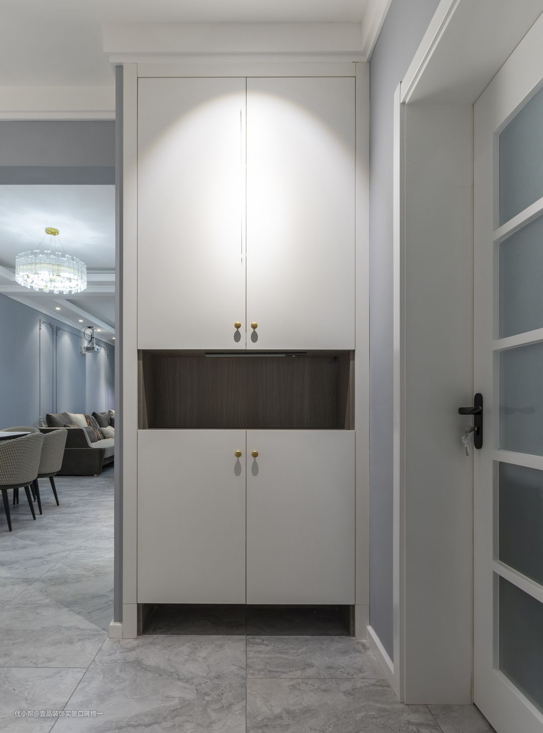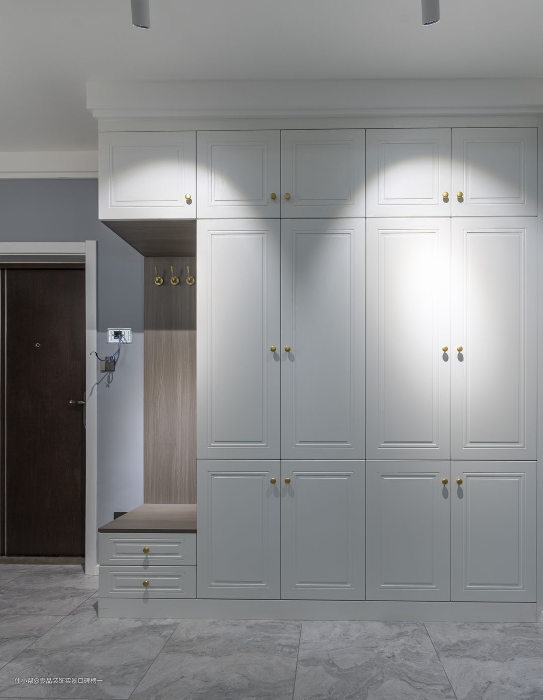 进门处就做了玄关鞋柜的位置,鞋柜的设计考虑到功能性,所以做了划分,挂衣板和柜体结合,可以满足不同衣物的放置,方便实用,衣柜的柜体选择了白色搭配原木色,在现代风格中经常会用到。