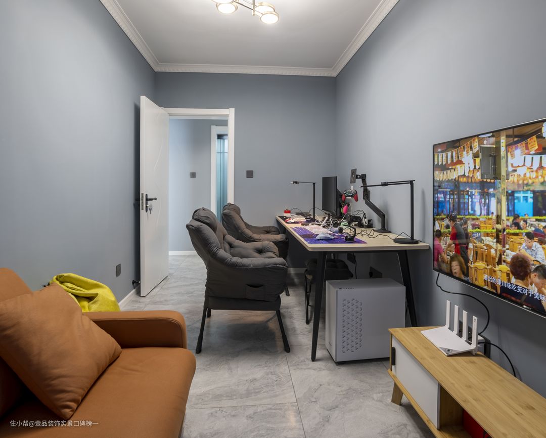 一间小卧室没有做复杂的设计,只是用了简单的软装进行布置,这个空间作为两个年轻人的娱乐场所,电脑的放置,电视的放置正是年轻人梦想的天堂,硬装设计中就比较简单了,地面瓷砖,墙面乳胶漆,正常的地脚线,其余的可以随意搭配。