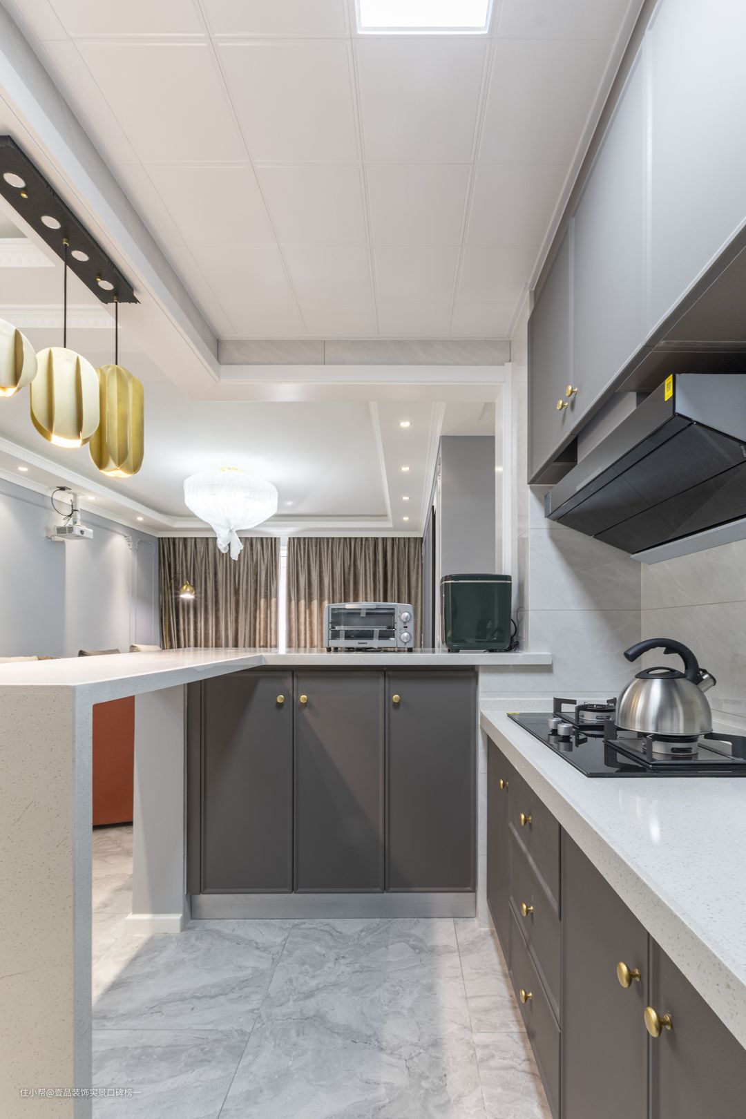卫生间选择的是开放式厨房,做一个吧台,时而有一些小小的情调,端上一杯红酒,惬意的摇晃着,开放式厨房色彩就需要格外注意,要与客厅空间相呼应,莫兰迪蓝色彩淡雅的灰色系完全符合,另外开放式厨房要特别注意油烟机和灶具,一定要选好,避免后期有烟满屋飞
