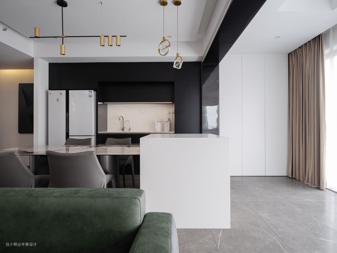 客餐厅的基础配色由黑、白、灰和胡桃木色构成,以墨绿色沙发和千鸟格单椅进行点缀。