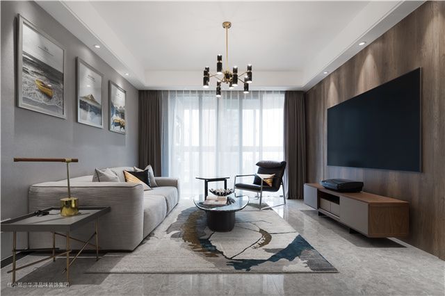 电视背景墙依旧使用大面积的胡桃木护墙板呼应玄关,不同灰度的地板、沙发、以及沙发背景墙,将空间划分成不同的层次。简约的主灯搭配嵌入式射灯,极其有规划的灯光设计,让客厅的照明主次有别,重点突出,空间的视觉效果也更加饱满。