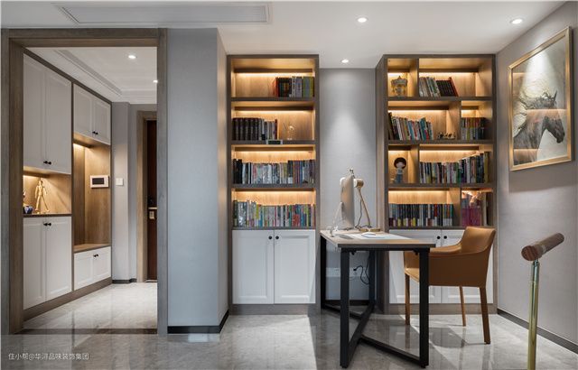 在客厅空间设置了一个开放式的书房,一个书柜、一套书桌椅就能满足业主平时的办公学习需求。