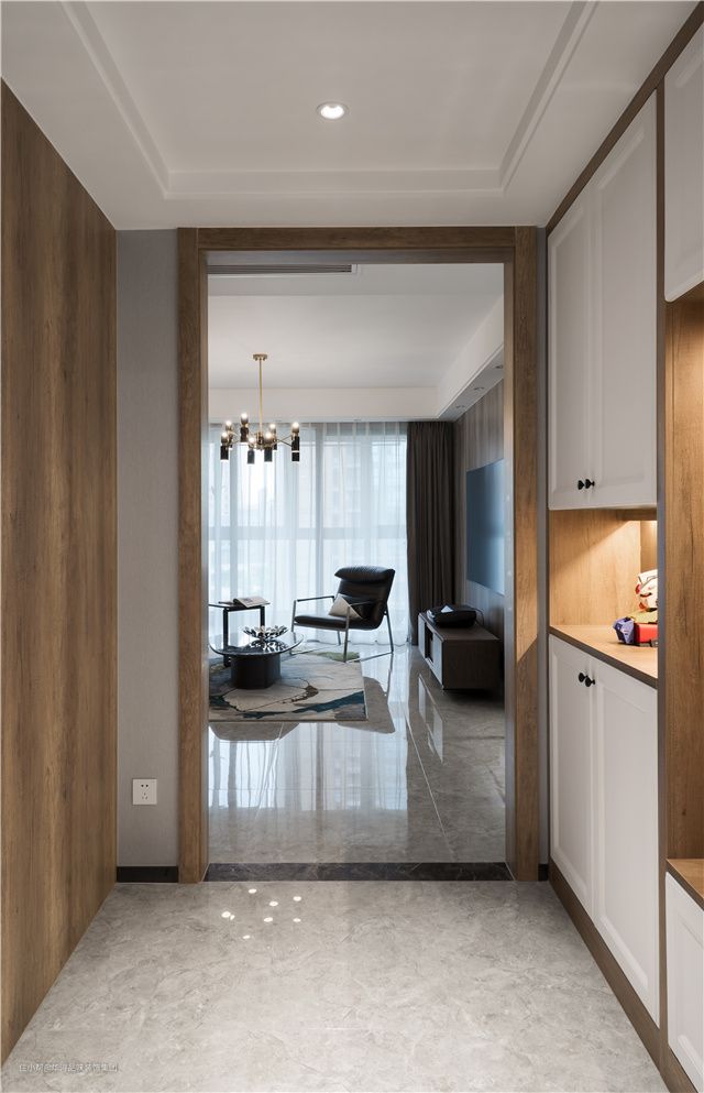 玄关空间一侧定制到顶的玄关柜,可收纳一家人的鞋子、以及临时悬挂外套,强大的收纳功能保持门厅的整洁,另一侧则安装胡桃木色的护墙板,与门框颜色相一致,保持空间的整体性。