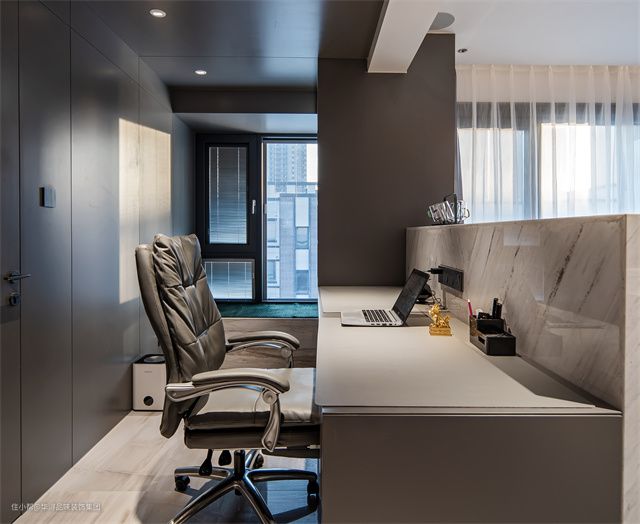 书房利用客厅的半高电视背景墙的另一侧,打造休闲办公区,与客厅既隔又合,不浪费任何一处空间。