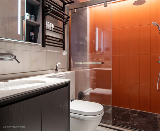 干湿分离卫生间,淋浴区用了透明玻璃推拉门,橙色墙面砖打破沉闷,撞色气质拿捏的刚刚好。
