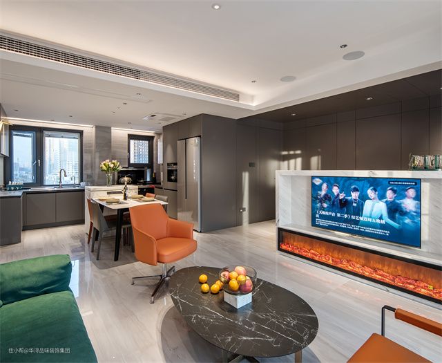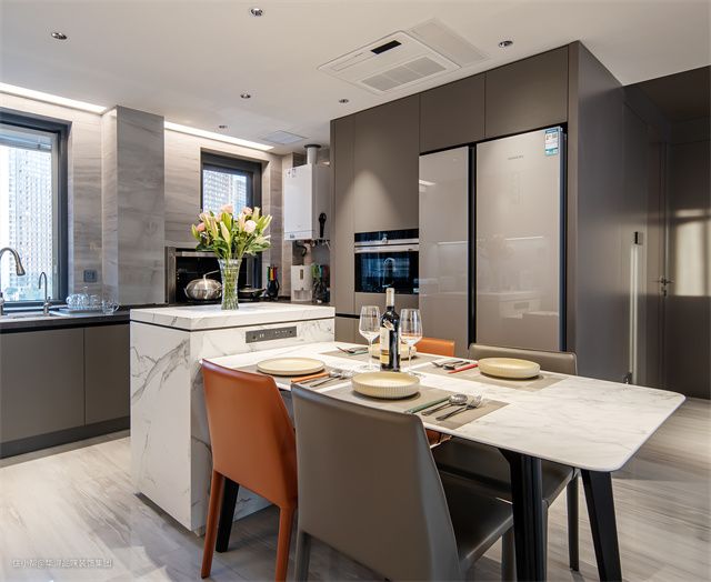 客厅灰色原木板与餐厅白色大理石餐桌吧台,材质相异,色调相融,洁净清爽中彰显理性的智慧;