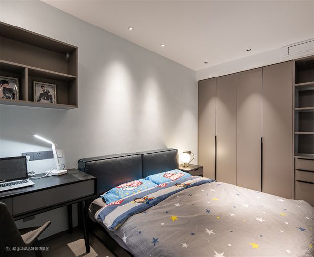 男孩房在硬装上还是以单一色调为主,房间的童趣还是由软装打造为主。