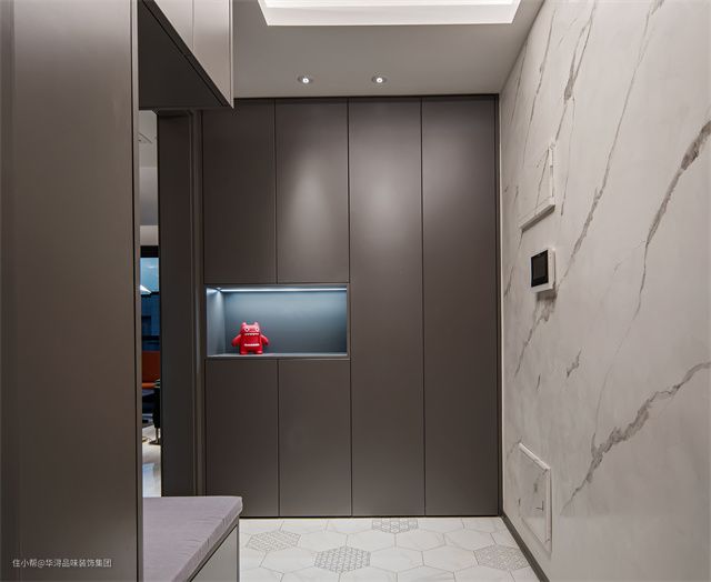 入户就是低调的高级灰,避免太过单调,整体收纳柜留出展示柜,摆上装饰品或放钥匙钱包都很实用。