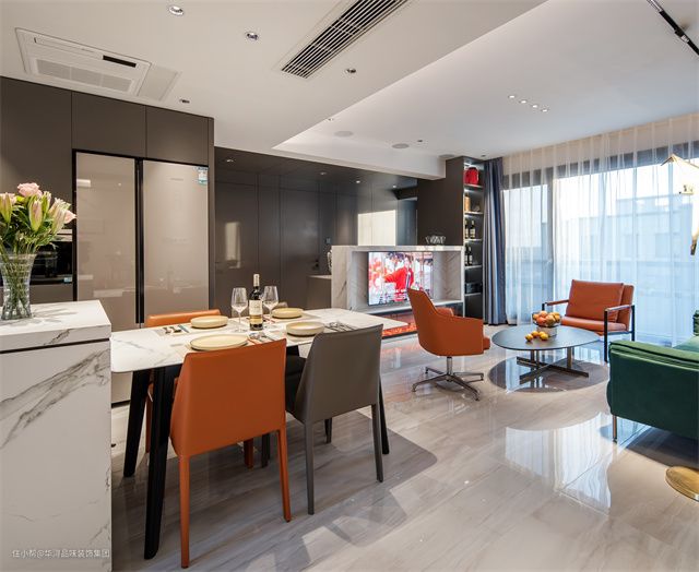 在餐厅与厨房之间打造一个小小中岛台,用来传送饭菜简直方便实用,大理石材质的运用、亮橙色点缀让餐厅的高级感呼之欲出。