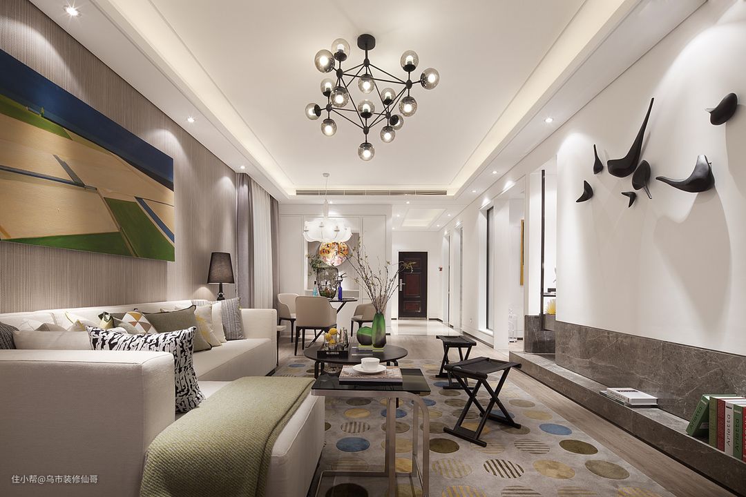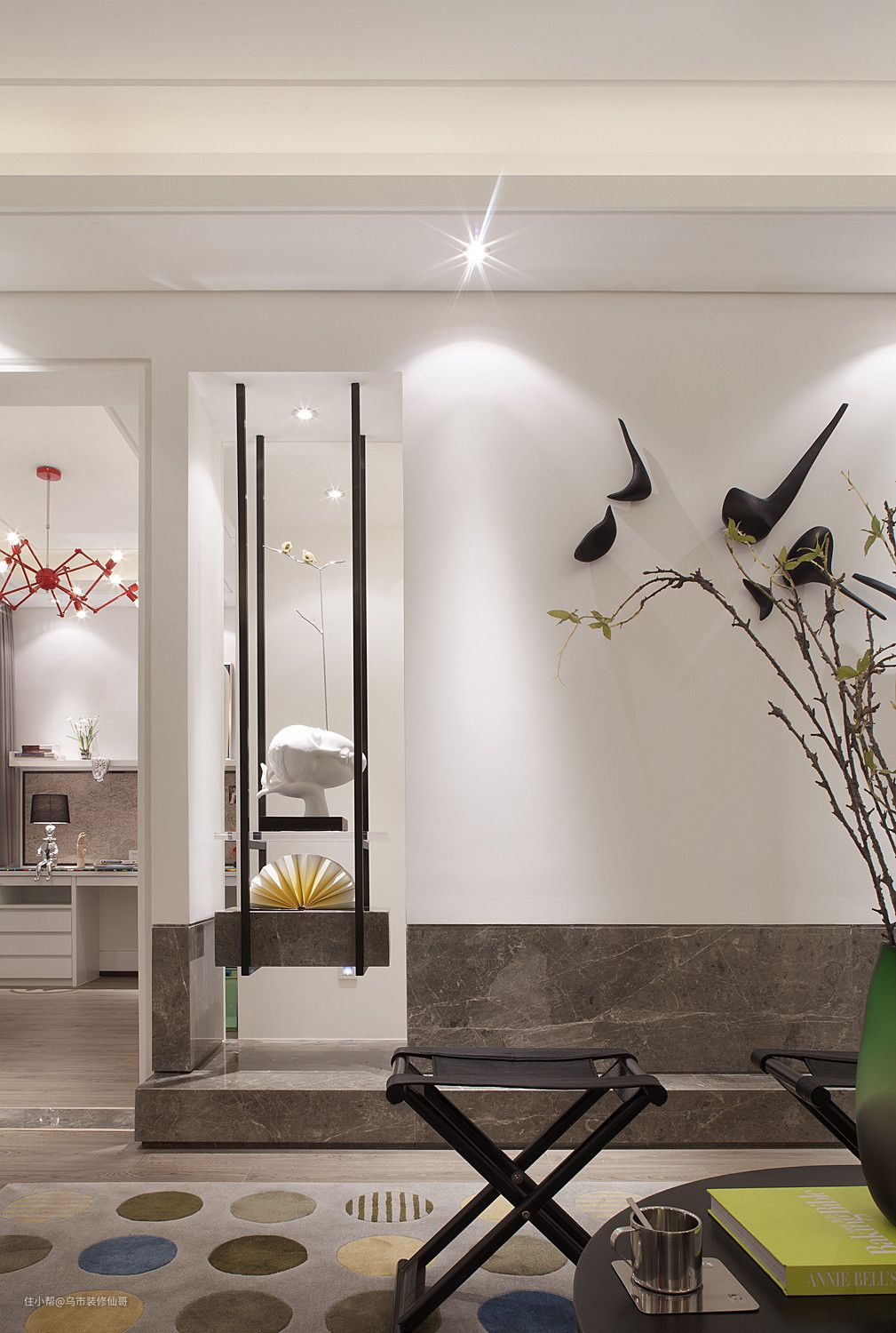 电视背景墙底部是石材,墙面用的乳胶漆,墙上黑色的装饰物件是点睛之笔,与纯白墙面形成对比,搭配射灯的光线,大大提升空间的美感。