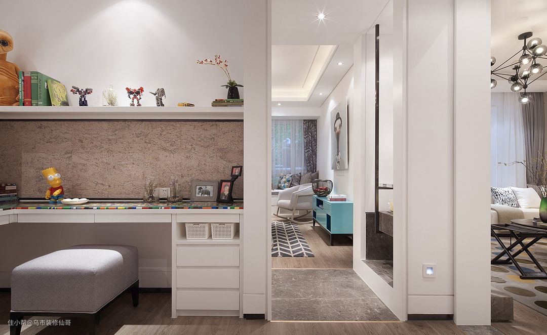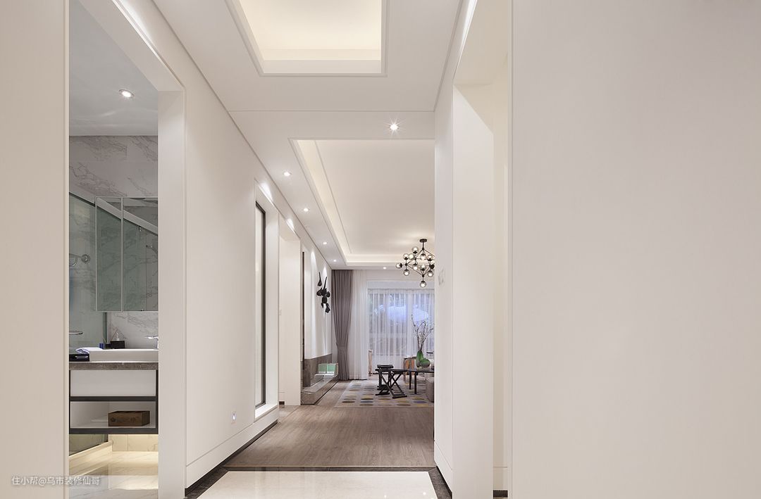 入户并没有做玄关,左边是干湿分离的卫生间,进门过道顶部做了石膏板吊顶,做了简单的区域划分,地面的瓷砖与木地板做了收口条,象征性隔出了入户过道与客厅的划分与顶面相呼应。