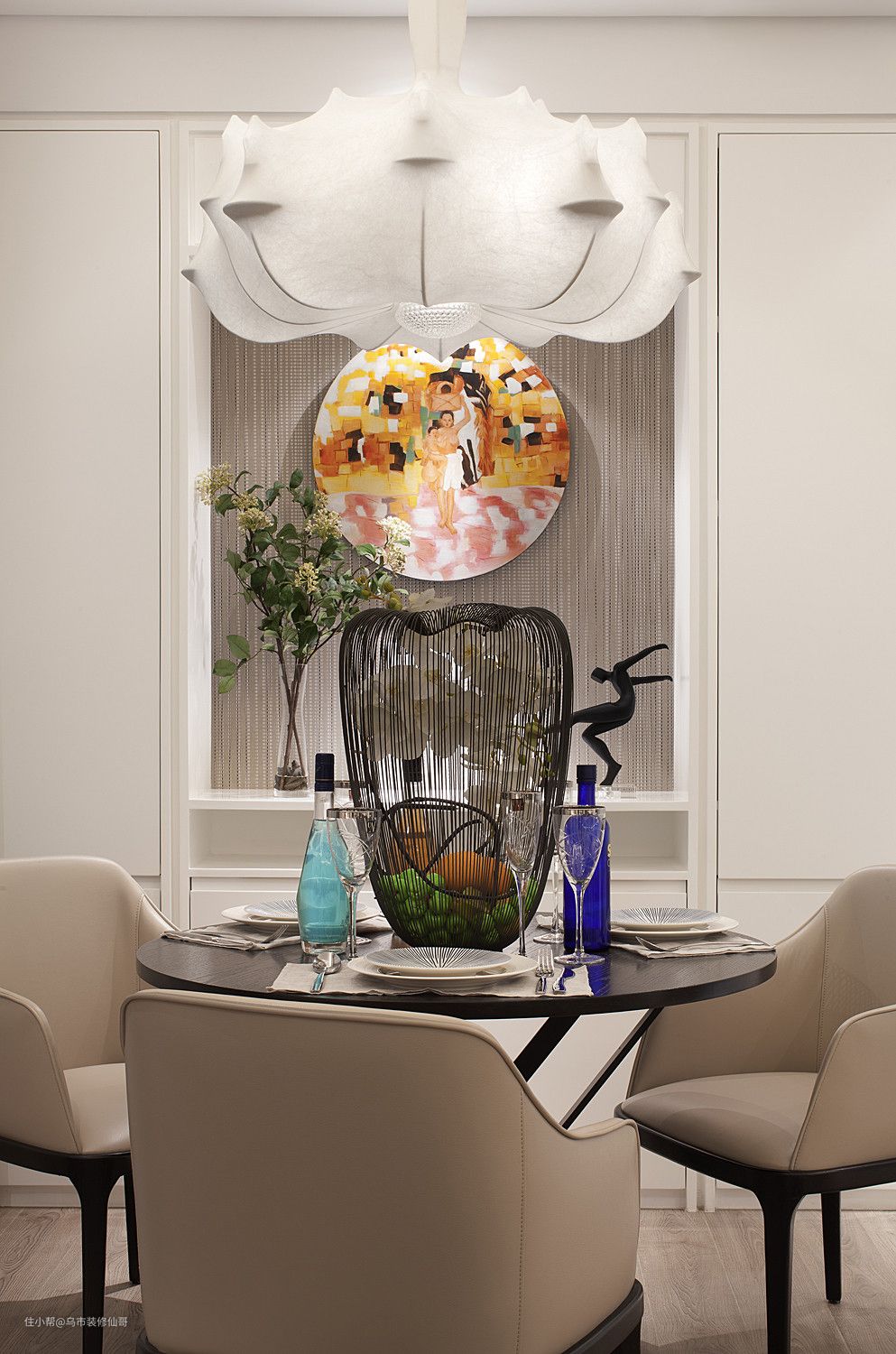 餐厅背景墙也是浅色壁布搭配彩色装饰画,加上台面的景观,达到更好的视觉效果。