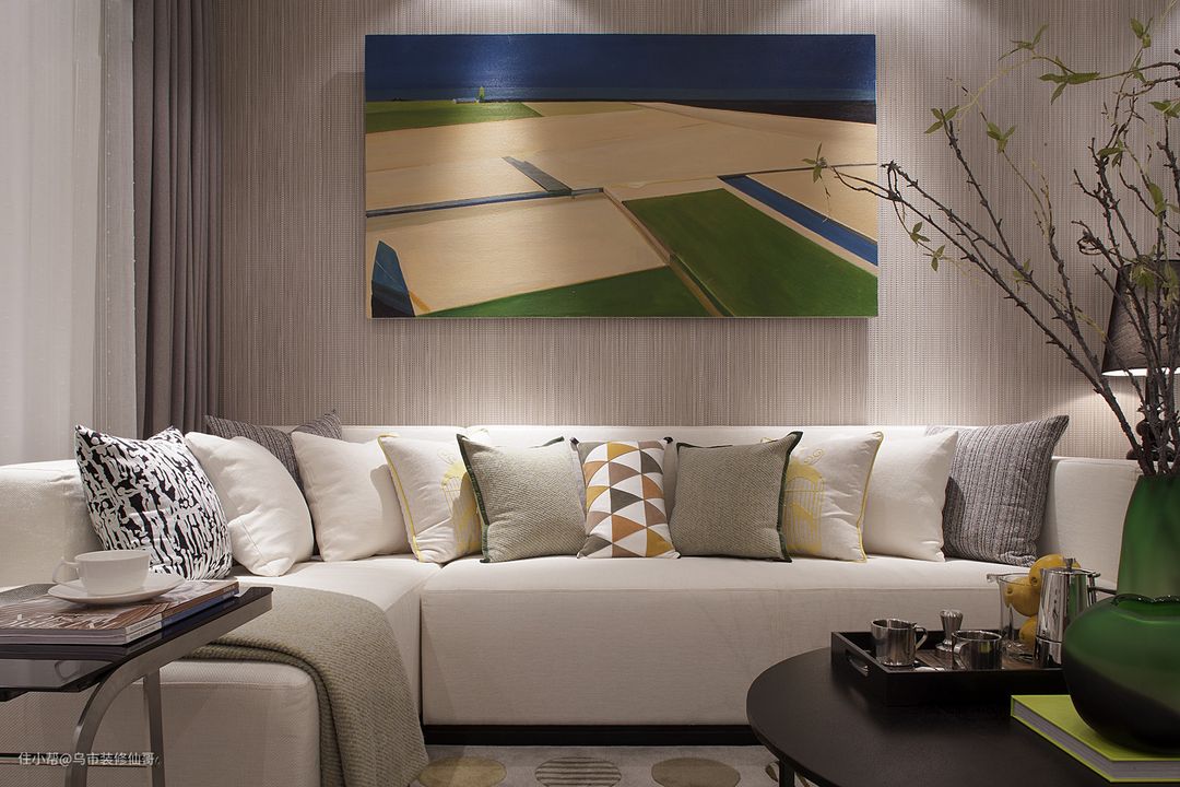 沙发背景墙是棉麻材质的浅色墙布,搭配一副色彩较深的装饰画,对比感更强,空间更有层次感。
