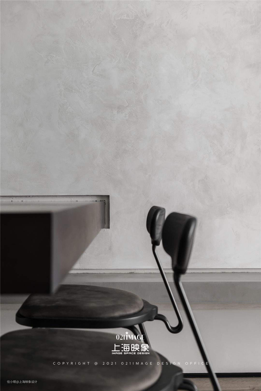 利用收纳柜和墙面之间的距离,在吊柜下方设置了悬空书桌,岩板材质的「重」在悬空的形式下,被大大中和了。视觉上的清透也产生了减少卫生死角的效果。