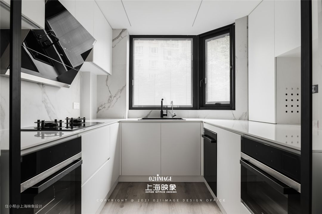 玻璃移门之内则是传统的中式厨房,U型橱柜保证了充足的收纳空间以及容纳嵌入式厨电。采用了错位的设计手法,将大容量储物柜嵌入墙面,同时也给墙面的另一侧的次卧提供了可以嵌入衣柜的空间。