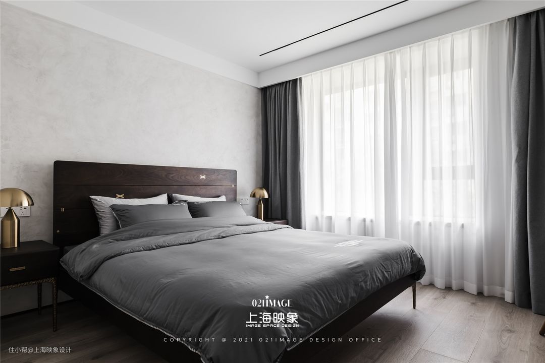 本案对主卧空间格局进行大幅度的调整,打造了集主卫、轻办公区和衣帽间的主卧空间。依然采用无主灯设计,搭配床头背景墙的浅灰色艺术漆,与胡桃木和黄头材质相得益彰。