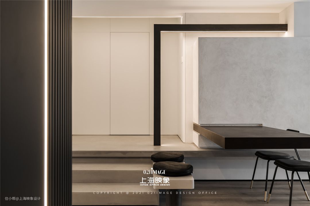 从错层楼梯开始,是本案的私人区域的部分。设计师采用了隐形门,减少了视觉上的冗杂。