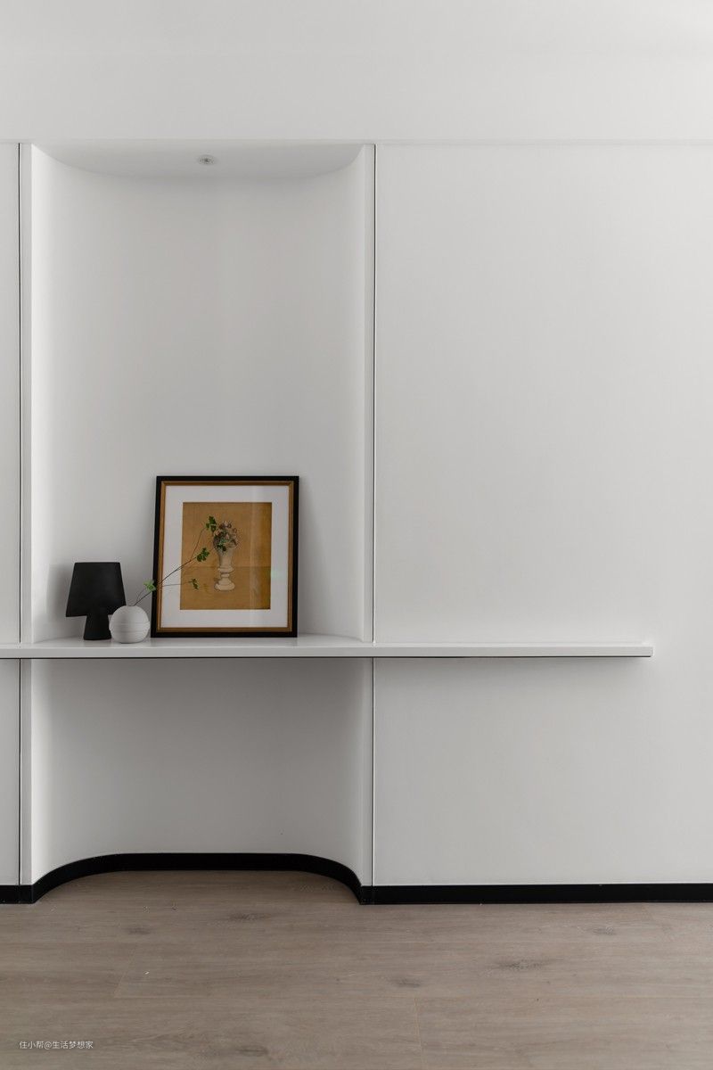 大面积白墙会给人带来一种单调乏味感,因此利用了弧形的造型让整个玄关空间变得时尚活泼。 玄关的顶部采用暖色射灯,烘托了玄关明朗、温暖的氛围,底部用了黑色踢脚线,配上摆件和装饰画,也使得整个门厅愈发个性有气质。