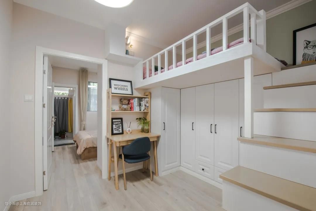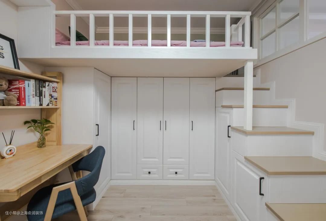 小女儿房采用高低床,将小面积用出双倍的效果,上面休息,下面储物,充分利用了每一个空间。