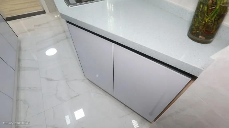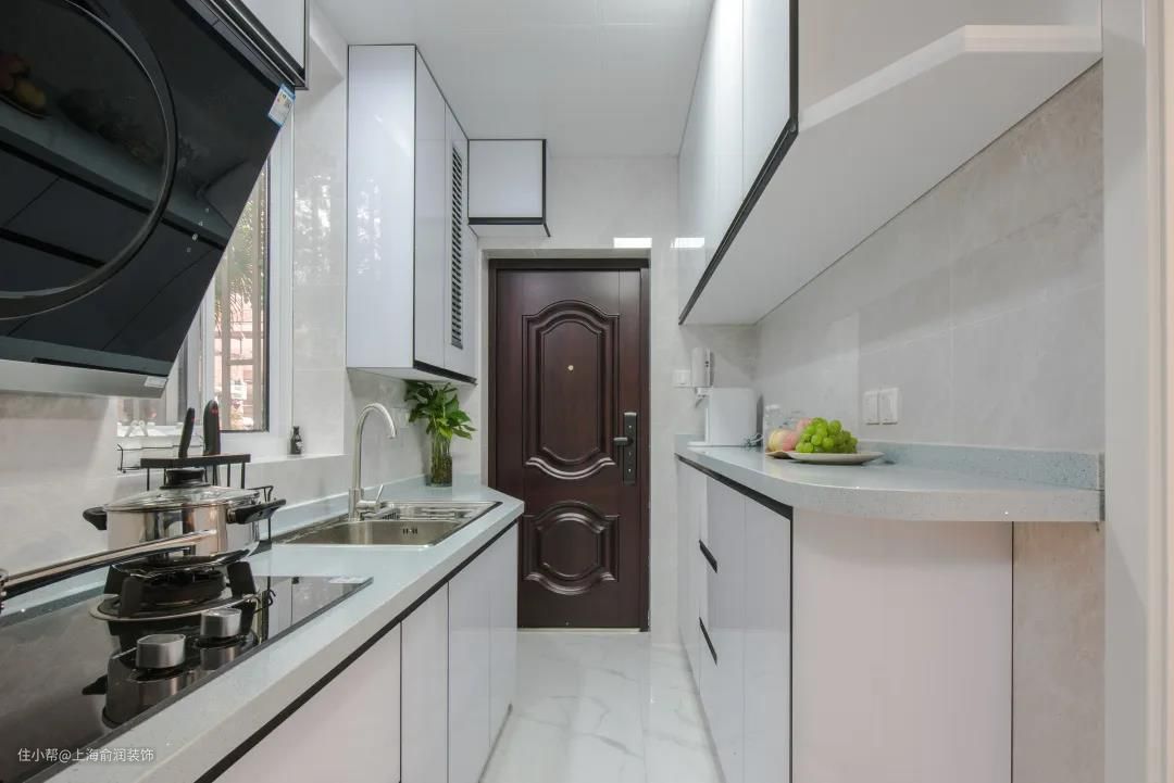 进门走道与厨房大变样,白色瓷砖与橱柜提高了空间采光度,加上充足的收纳,不大的空间也显得清爽整洁。