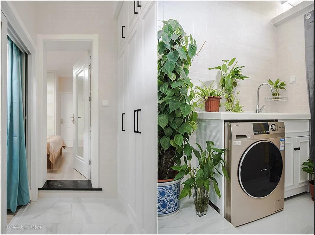 天井阳台经过一番修整,变得干净整洁,设计师重新赋予了它储物、洗衣的功能,小小的洗衣柜还能备用洗漱池,起到洗漱分流的作用。