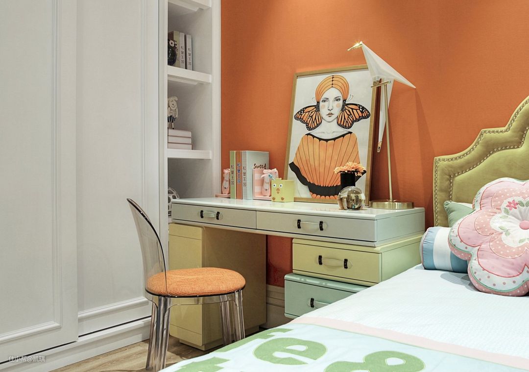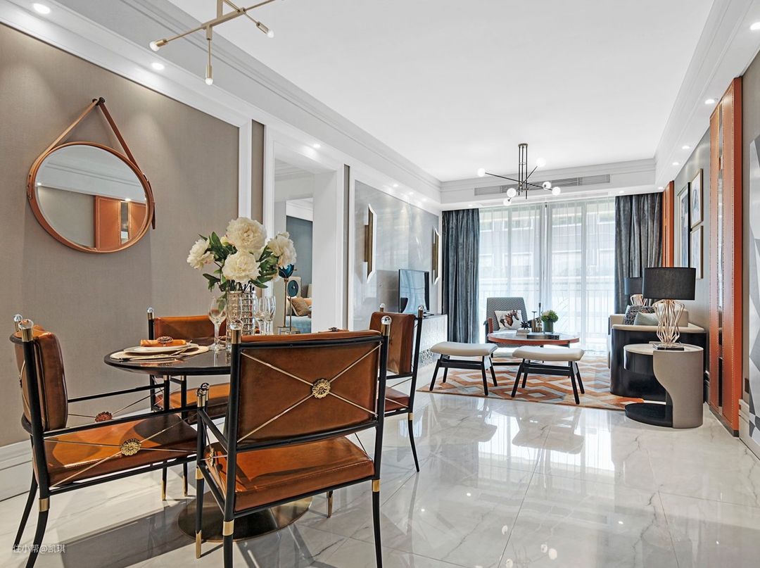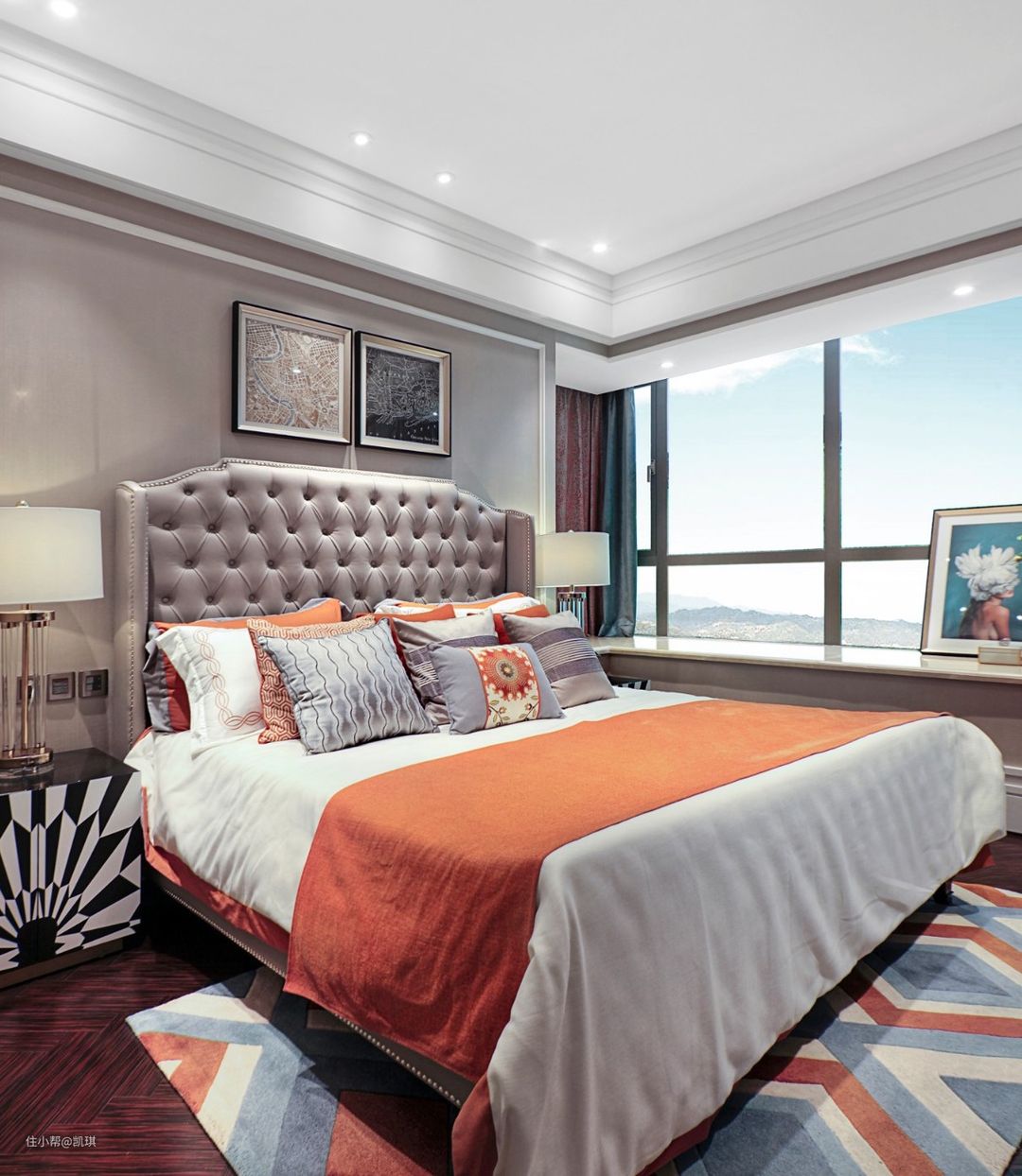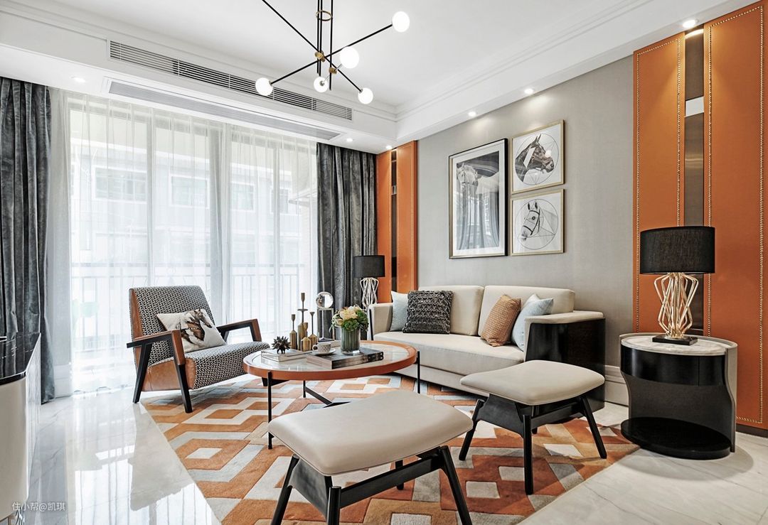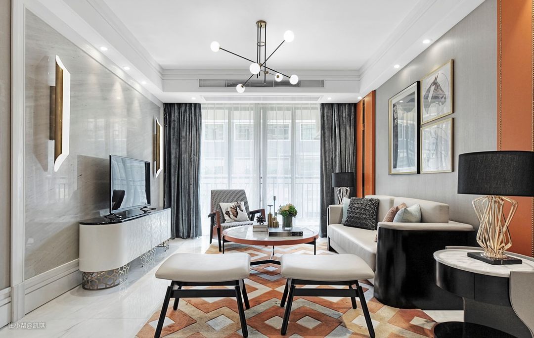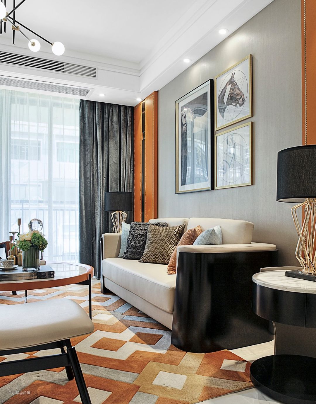 客户是国际导游,经常国内国外飞来飞去,见多识广。户型结构方正,在立面造型设计上,绕过普遍的浅色系,本方案中的爱马仕橙色本身就非常艳丽高级,搭配时尚铆钉的设计,更一步提升细节与档次。整个方案中其他材质和家具色调偏中性或与橙色呼应,在橙色的鲜明视觉冲击下,用局部的灰色窗帘,局部的深暗材质来降低空间的亮度,让人感觉大方明媚且不刺眼招摇。