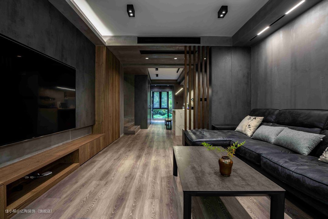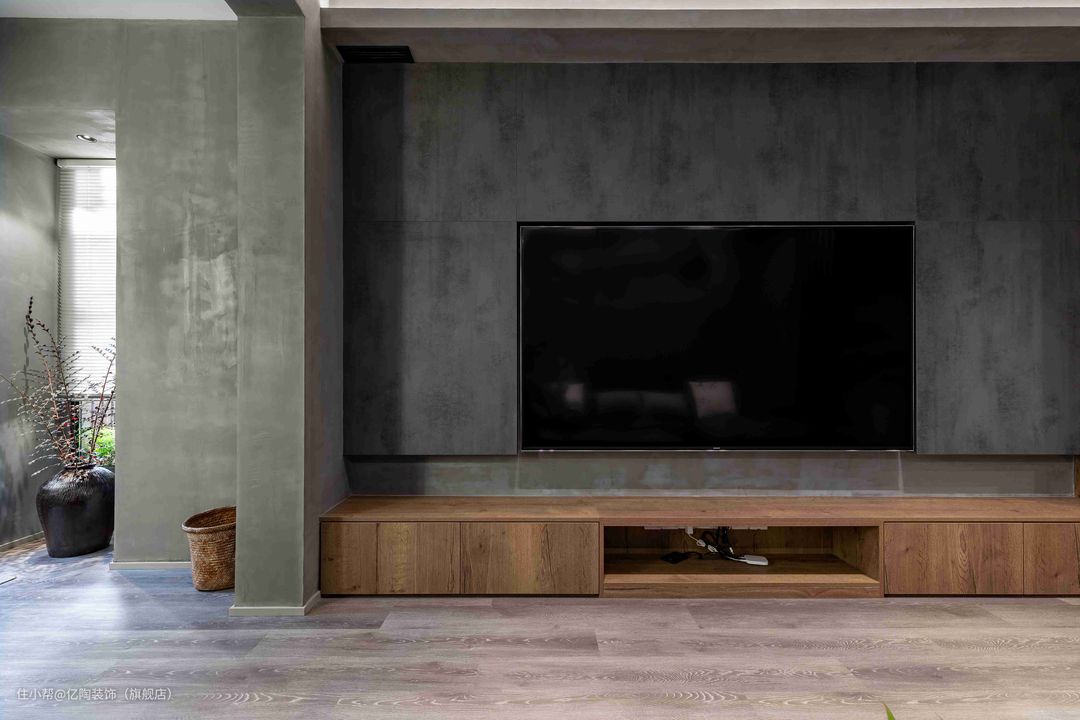 木栅栏的隔断里面是客厅区,水泥墙的电视背景墙体现出工业风的冷冽质感。