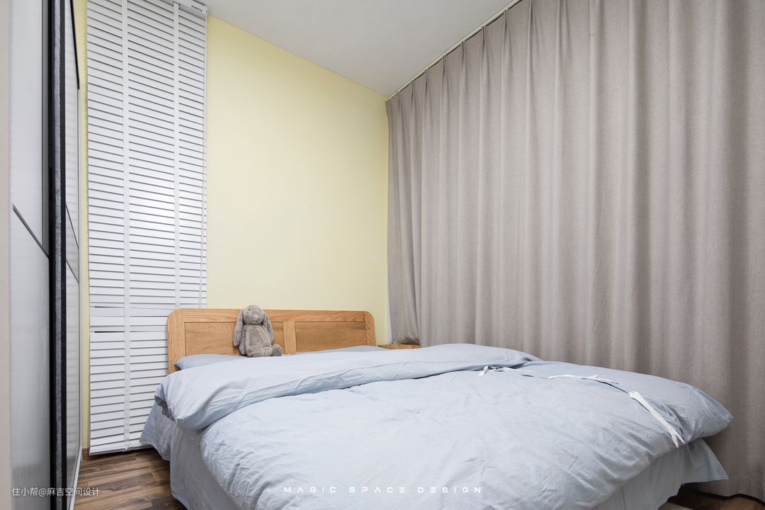 卧室床头有个窗户不能封上,但是空调外机也在这里裸漏,影响观赏性,所以增加了白色的百叶帘遮挡,自由转换采光效果。高级灰窗帘增加遮光率,木系床和地板色做衔接,移门衣柜节省动线空间。