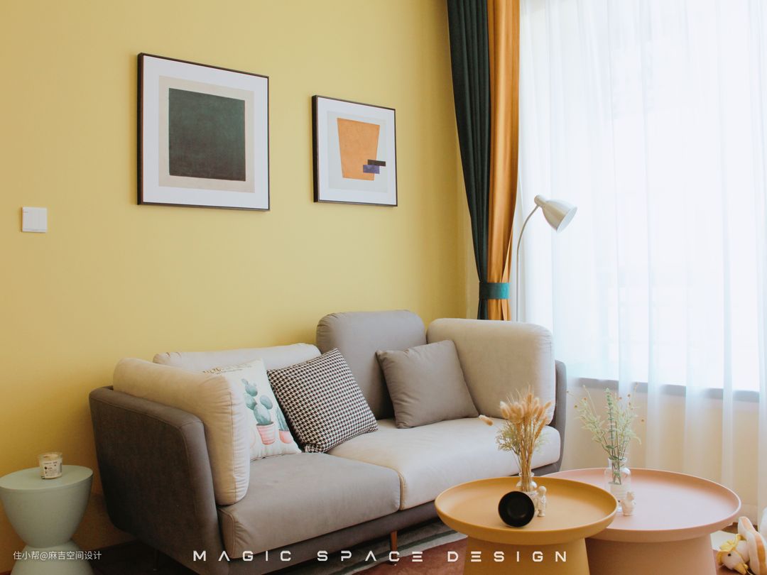 1.Q: 装修过程花了多长时间? A: 施工改造1个月加软装采购进场完成全部安装摆场1个月 ,合计2个月。 2.Q: 说说是什么给了你灵感,打造出现在这个作品的? A: 业主希望自己居住的环境温馨舒适、活泼 ,特别提出希望家里大面使用浅黄色系。所以大面积是以黄色系为底搭配其他比较活泼的软装配饰 。 3.Q: 你对这套作品最满意的地方在哪里,为什么? A: 预算控制及落地品质业主都比较满意。 4.Q: 对平面布局做了哪些优化改动,为什么? A: 进门及干区墙体尺寸做了调整,解决原来进门看到马桶的尴尬场景,干区台盆的墙体拆除一半高度,让连接卫生间、厨房、过道、干区 的空间变得更开阔,整加空间通透感,不会给人空间狭窄的感觉。
