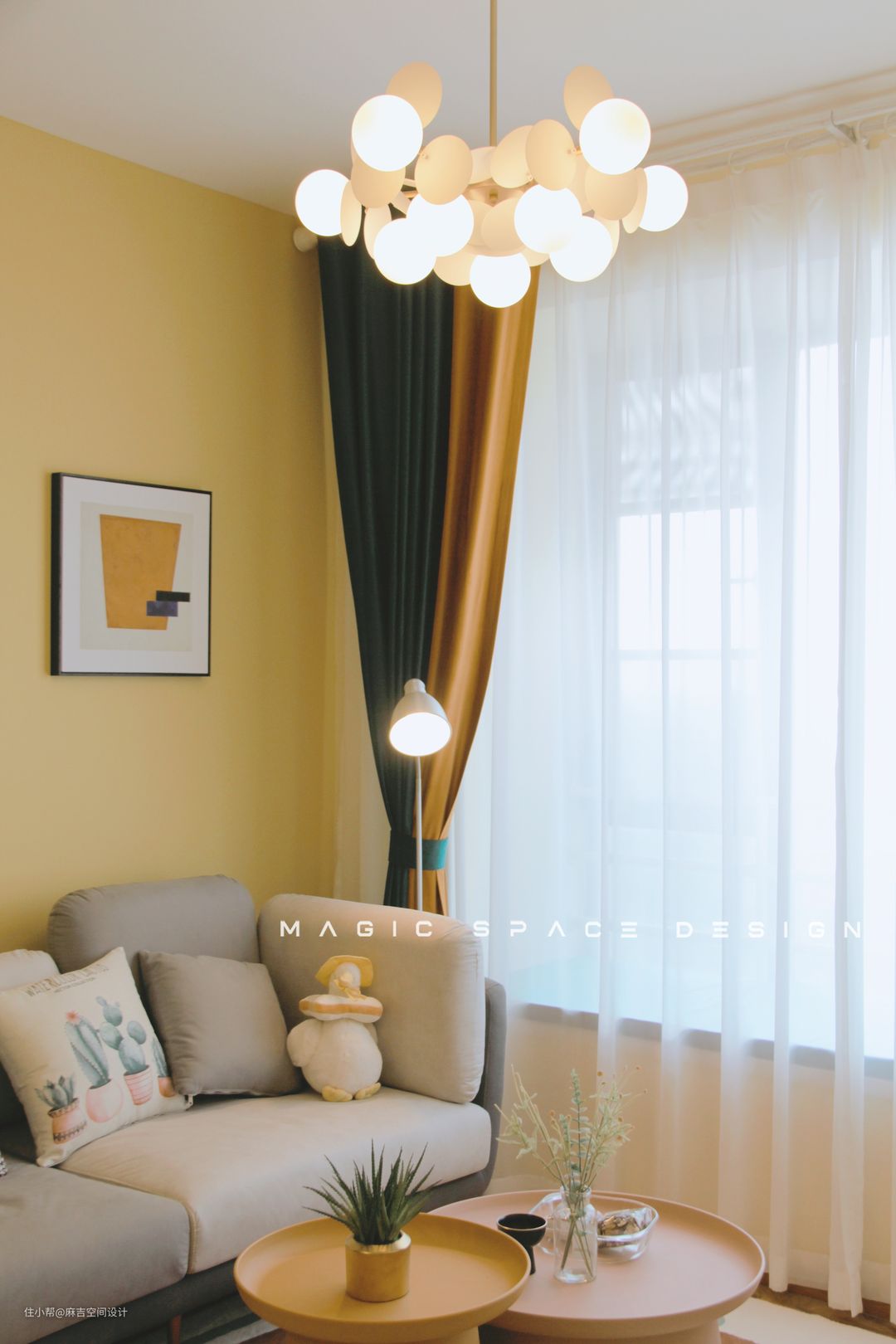 泡泡吊灯被引入客厅,未跟从当下潮流选择无主灯设计,自己喜欢才是王道!弧度落地灯可以大范围照明,夜半时分,不开主灯就可以拥有自己的惬意小角落。马卡龙色北欧茶几也很友爱啊!