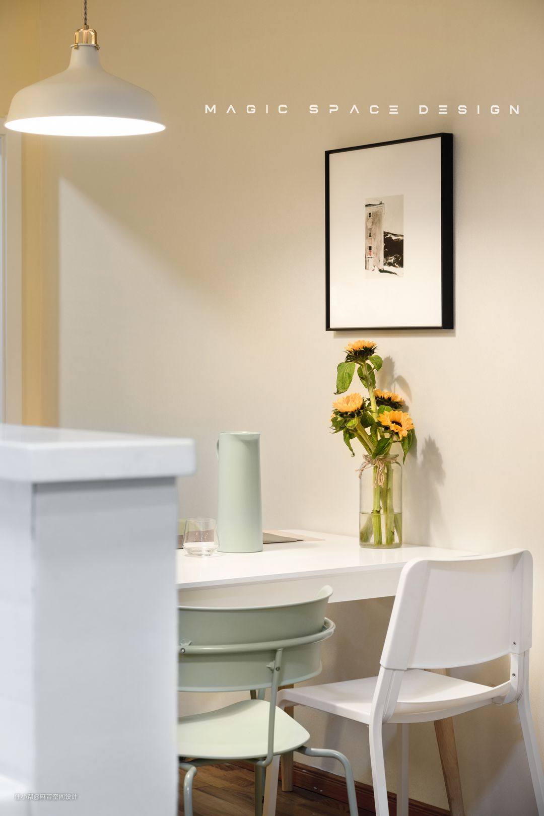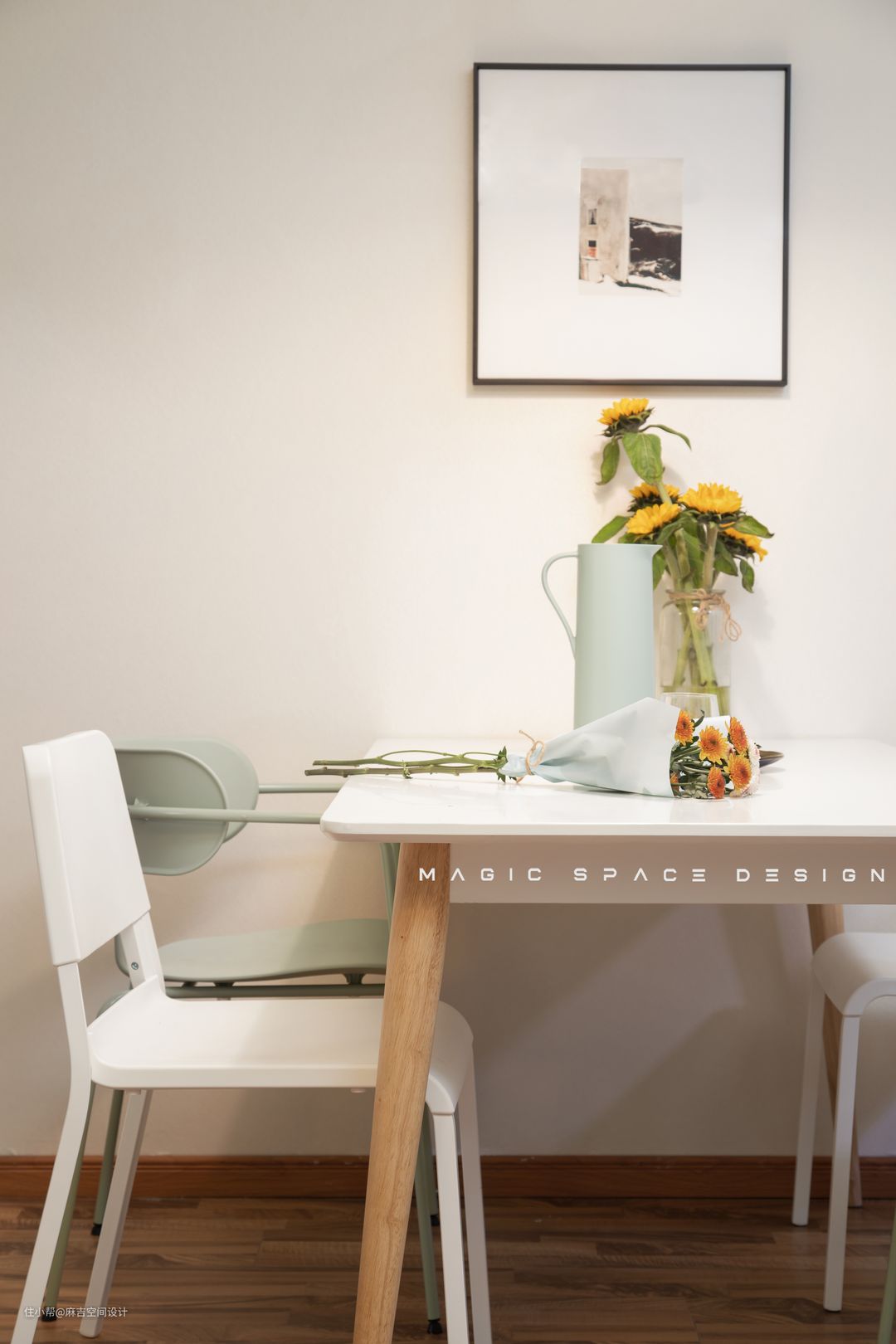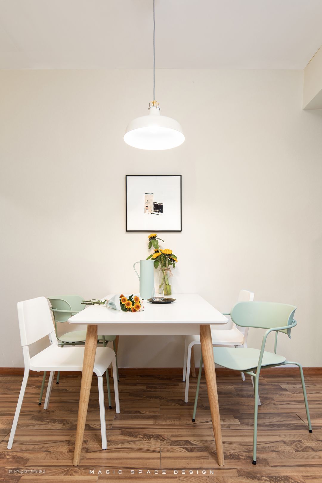 餐厅选用了四人坐的餐桌,偶尔也能接待几位亲朋好友,北欧白色桌面干净整洁,桌腿原木风过渡到地面,整个空间明亮简单。