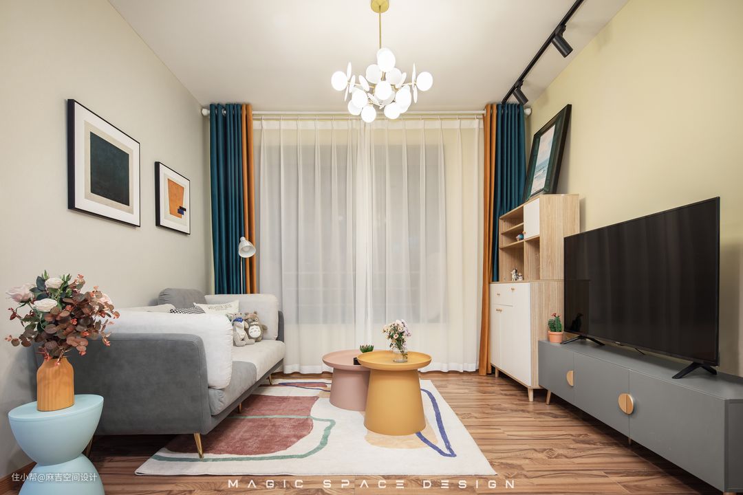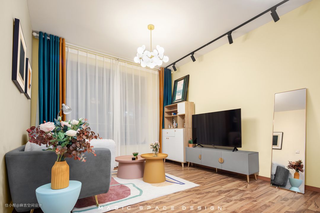 纱帘用来白天过滤光线,深色布艺窗帘可以最大限度的增加折光率,地面上的可爱纹理地毯与电视柜之间留出700mm的距离给予人员流动,空间感都被把控在细节里。