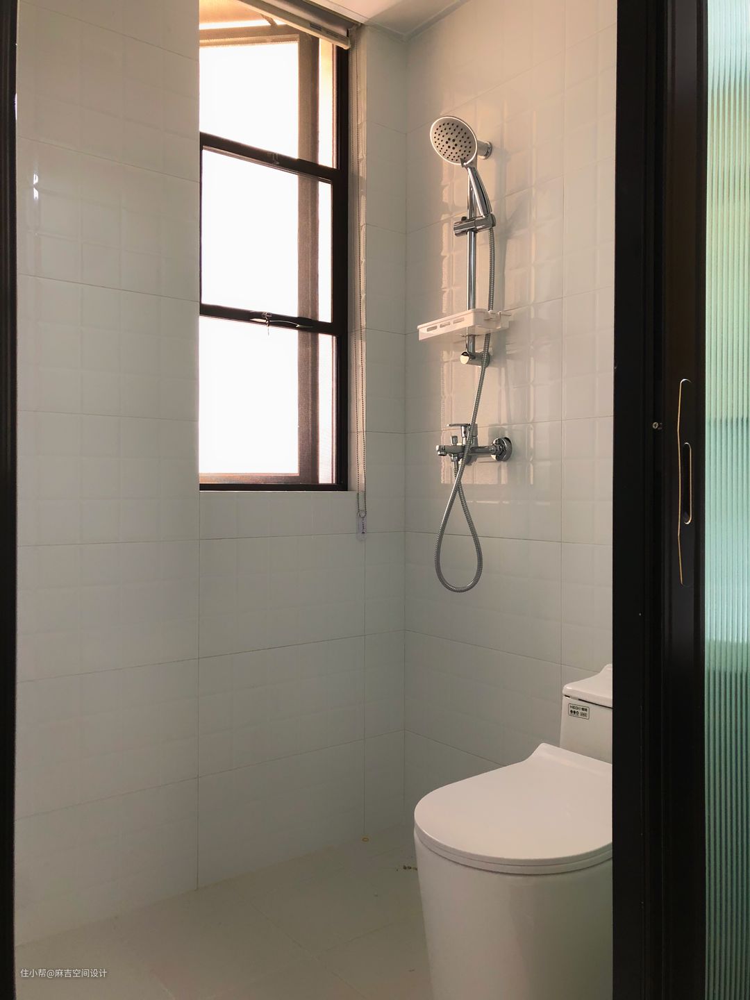 淋浴间做了干湿分离,选择了普通的小方砖,简单大方;洗手池位置选择了黑色调,精简节制;长虹玻璃柜门保护隐私的同时增加通透性。