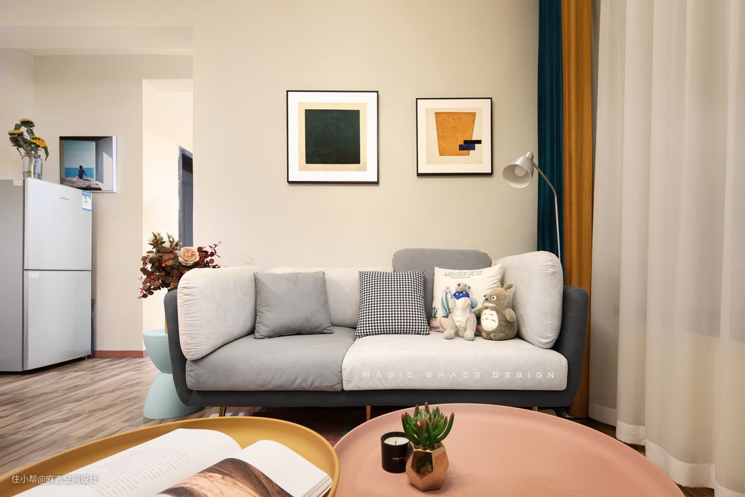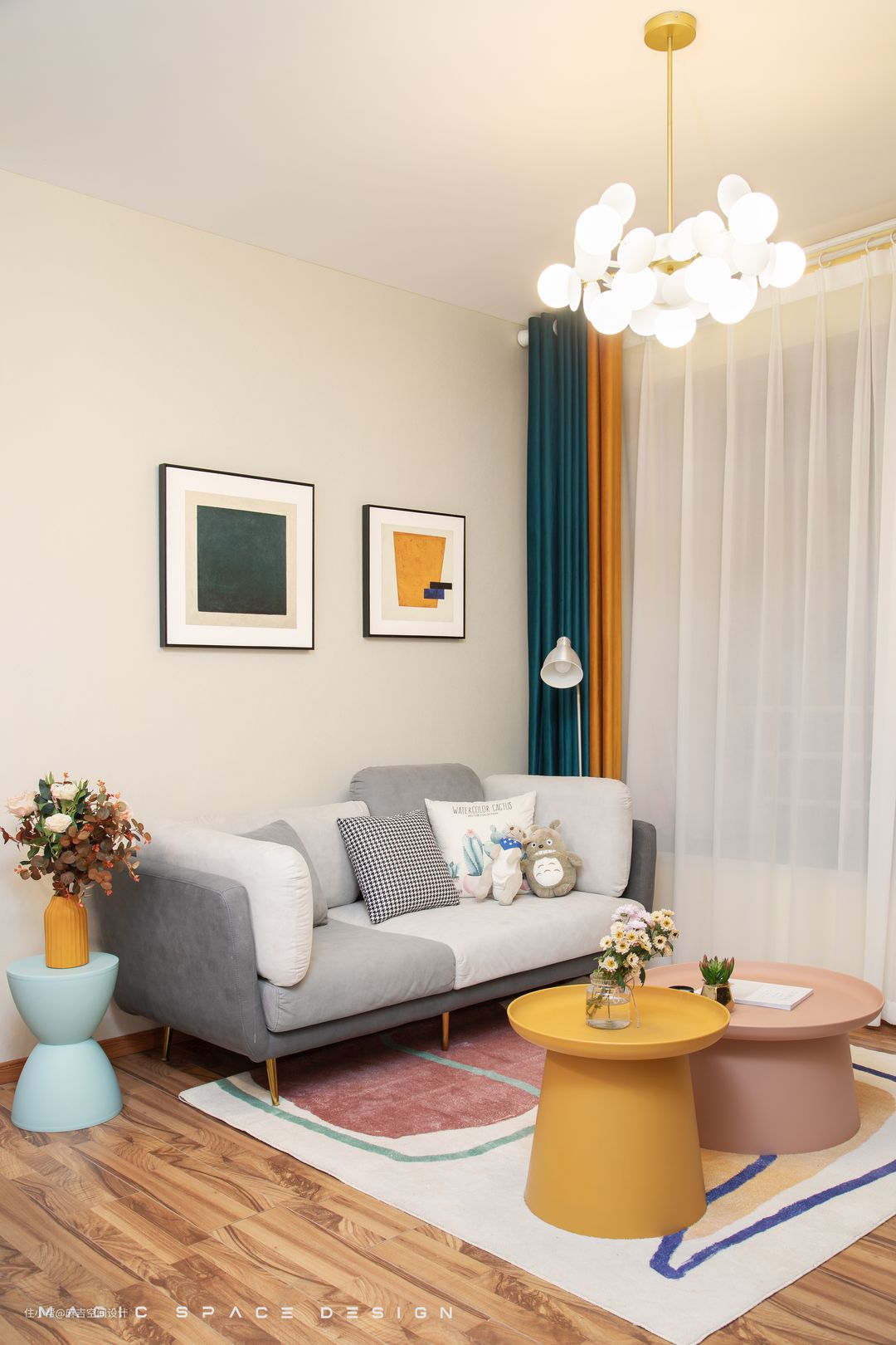 泡泡吊灯被引入客厅,未跟从当下潮流选择无主灯设计,自己喜欢才是王道!弧度落地灯可以大范围照明,夜半时分,不开主灯就可以拥有自己的惬意小角落。马卡龙色北欧茶几也很友爱啊!
