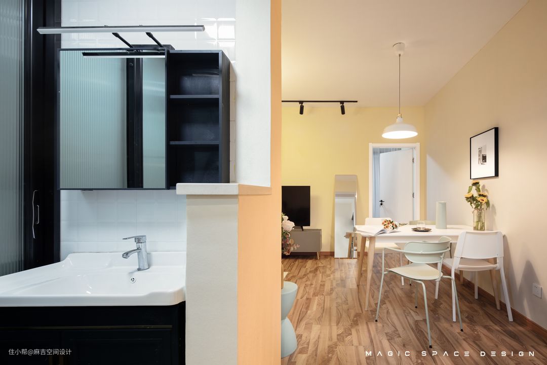 1.Q: 装修过程花了多长时间? A: 施工改造1个月加软装采购进场完成全部安装摆场1个月 ,合计2个月。 2.Q: 说说是什么给了你灵感,打造出现在这个作品的? A: 业主希望自己居住的环境温馨舒适、活泼 ,特别提出希望家里大面使用浅黄色系。所以大面积是以黄色系为底搭配其他比较活泼的软装配饰 。 3.Q: 你对这套作品最满意的地方在哪里,为什么? A: 预算控制及落地品质业主都比较满意。 4.Q: 对平面布局做了哪些优化改动,为什么? A: 进门及干区墙体尺寸做了调整,解决原来进门看到马桶的尴尬场景,干区台盆的墙体拆除一半高度,让连接卫生间、厨房、过道、干区 的空间变得更开阔,整加空间通透感,不会给人空间狭窄的感觉。