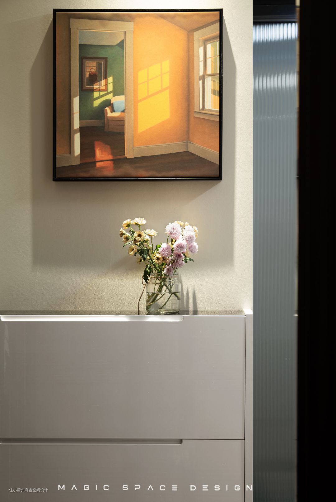 入户因距离等原因,选择了矮柜搭配挂画的形式,满足基础功能的同时增加空间感,在射灯的加持下,给人眼前一亮的感觉;一盆简单的小雏菊清新活泼、巷见画室购买的挂画足够触碰内心最柔软的角落。