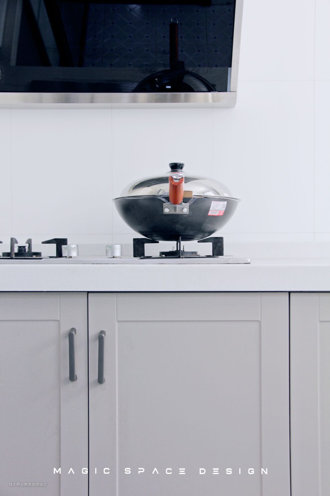 原本蓝色的橱柜被高级灰代替,操作台面做了更换,厚重的线条感让厨房也有了一些归属感,铝扣板吊顶加暖风机配置,外设移门更轻便。