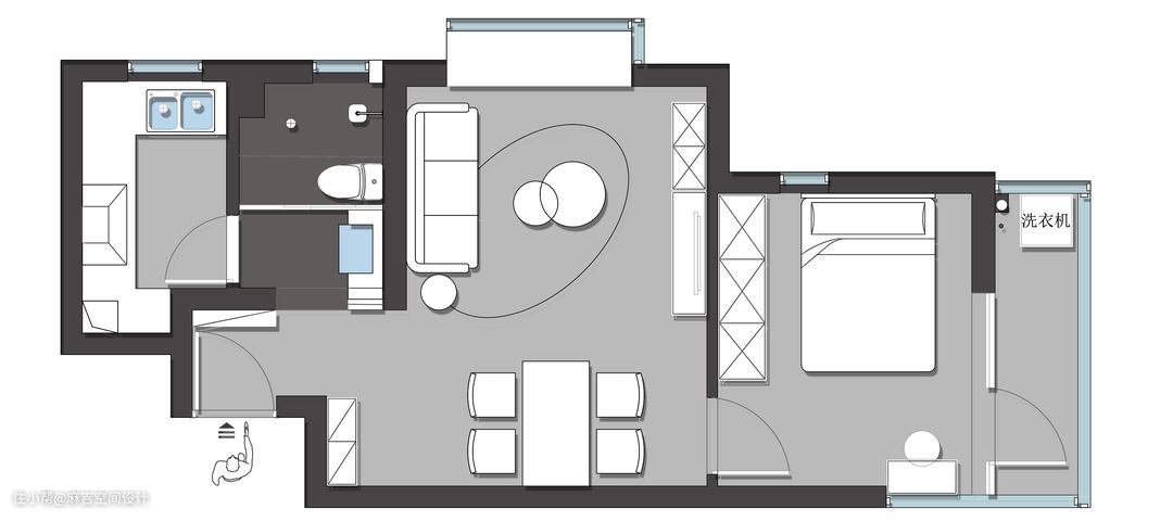在基本不动原户型的前提下,进门处墙体略向右扩展,增加鞋柜的储存面积,同时避免一进门就看到洗手间的尴尬,洗手间做干湿分离,洗手池与室外做沟通,实现到家先洗手的习惯。 客餐厅一体,电视背景墙做部分收纳更清爽同时满足业主需求,卧室作为静区自然是放在最里面,不过由于阳台大面积窗户,隔音性未达到理想状态,所以取消了原本的平开门,用推拉门代替。