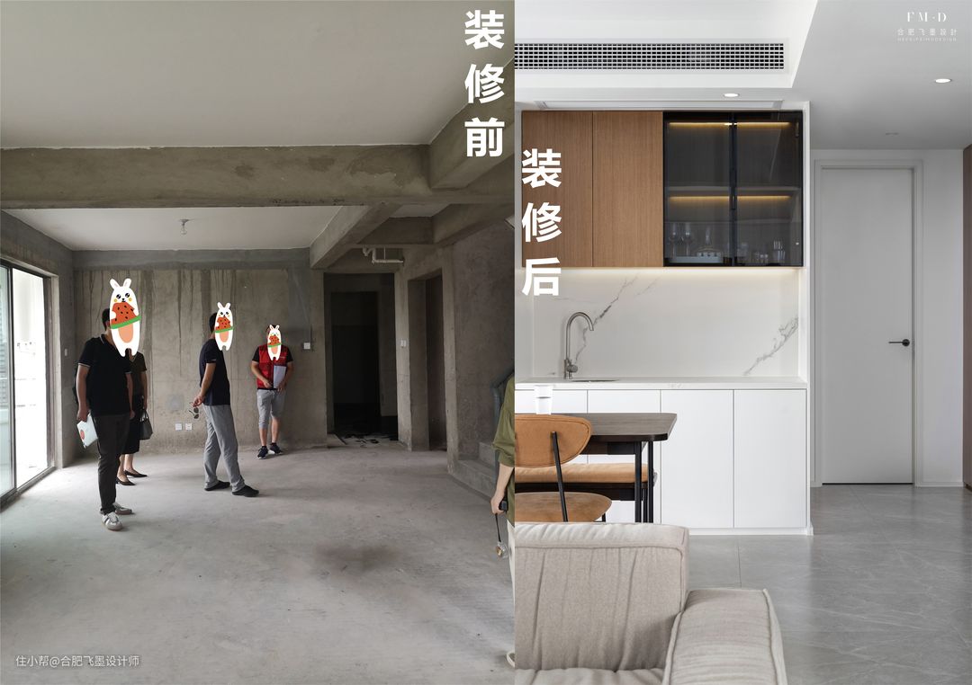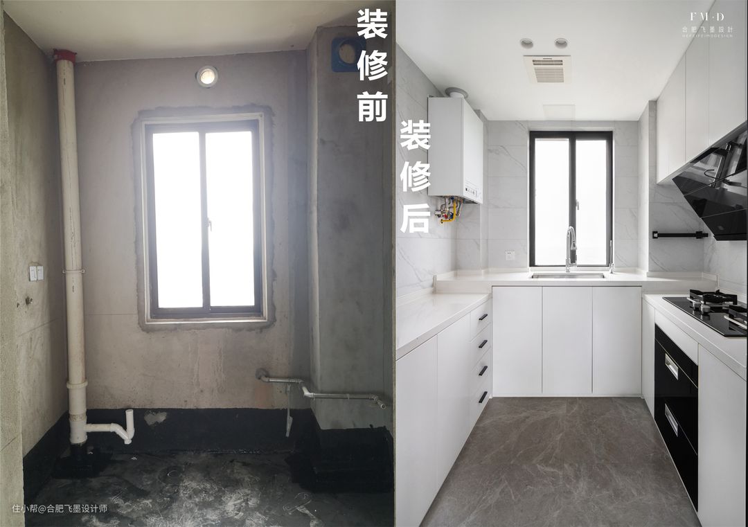 量房现场时拍的毛坯现场,与现在装修后的实景呈现出来的视觉效果真的很强! 餐厅区域,利用墙面打制餐边柜,赋予日常生活里的实用性。“人间烟火气 最抚凡人心”,厨房面积虽然不大,但U型布局充分利用了空间,又继续保持通透感。