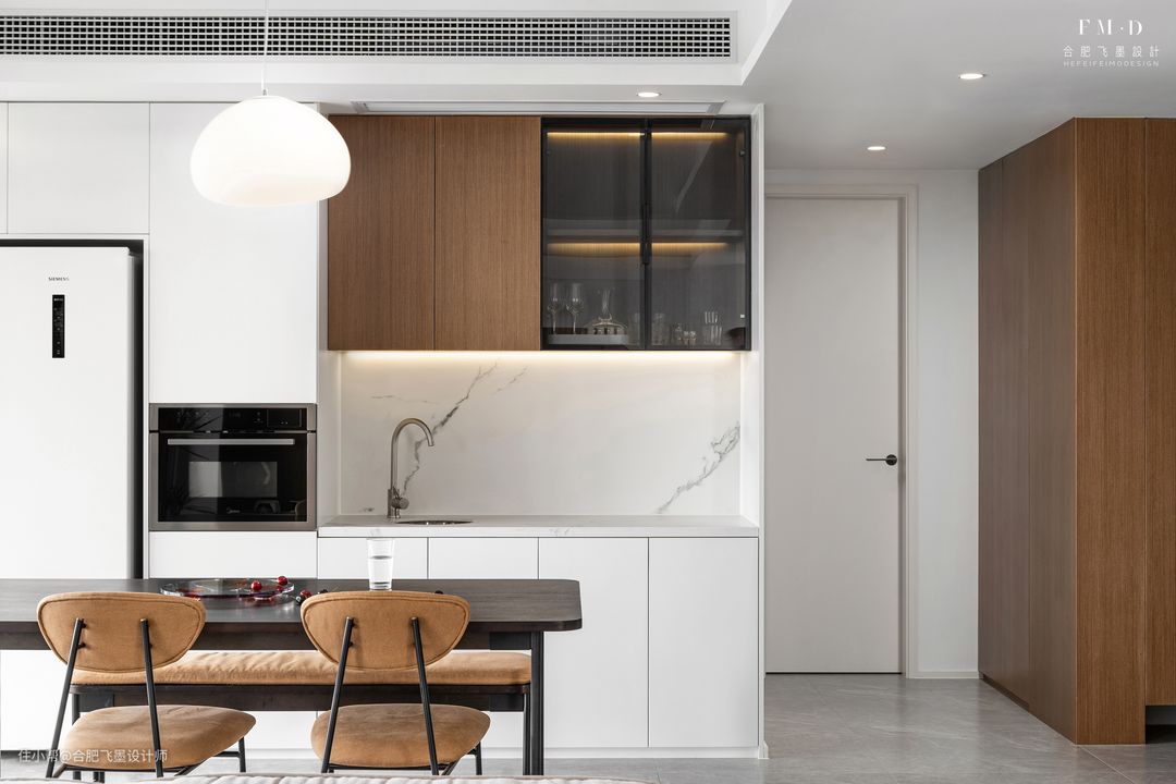 餐边柜用透明柜门与木质柜门相结合,展示、收纳都能得到满足;嵌入水吧,缩短空间动线,烧水、洗水果,都很便捷;冰箱、烤箱也选择嵌入餐边柜,解放厨房空间,延展餐厅功能。